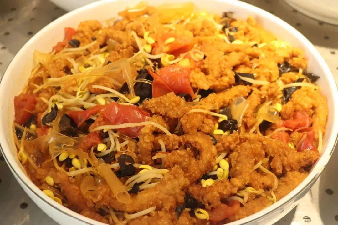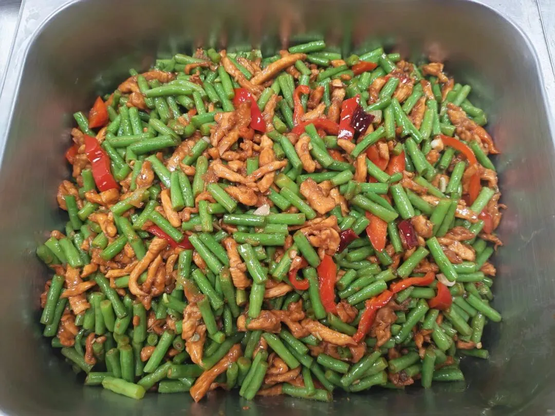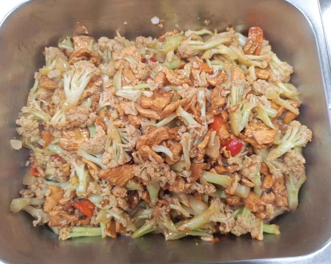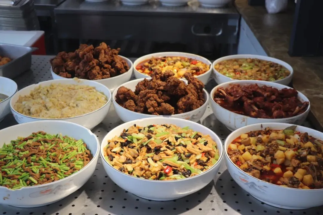 河南烩菜(肉60g豆腐20g白菜20g粉条20g)、啤酒鸭(土豆80g鸭块80g)、农家一碗香(青椒40g肉片80g荷包蛋40g)、干锅花菜(花菜80g肉80g)、豆腐小酥肉(豆腐80g肉80g)、蒸鸡腿(鸡腿70g)、手工鸡排(鸡肉70g)、蒜香青菜(小白菜100g)、酸辣绿豆芽(绿豆芽80g青红椒20g)