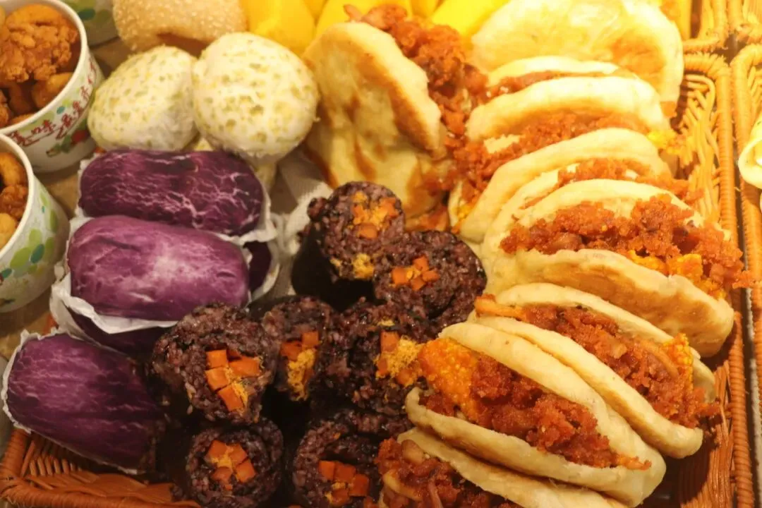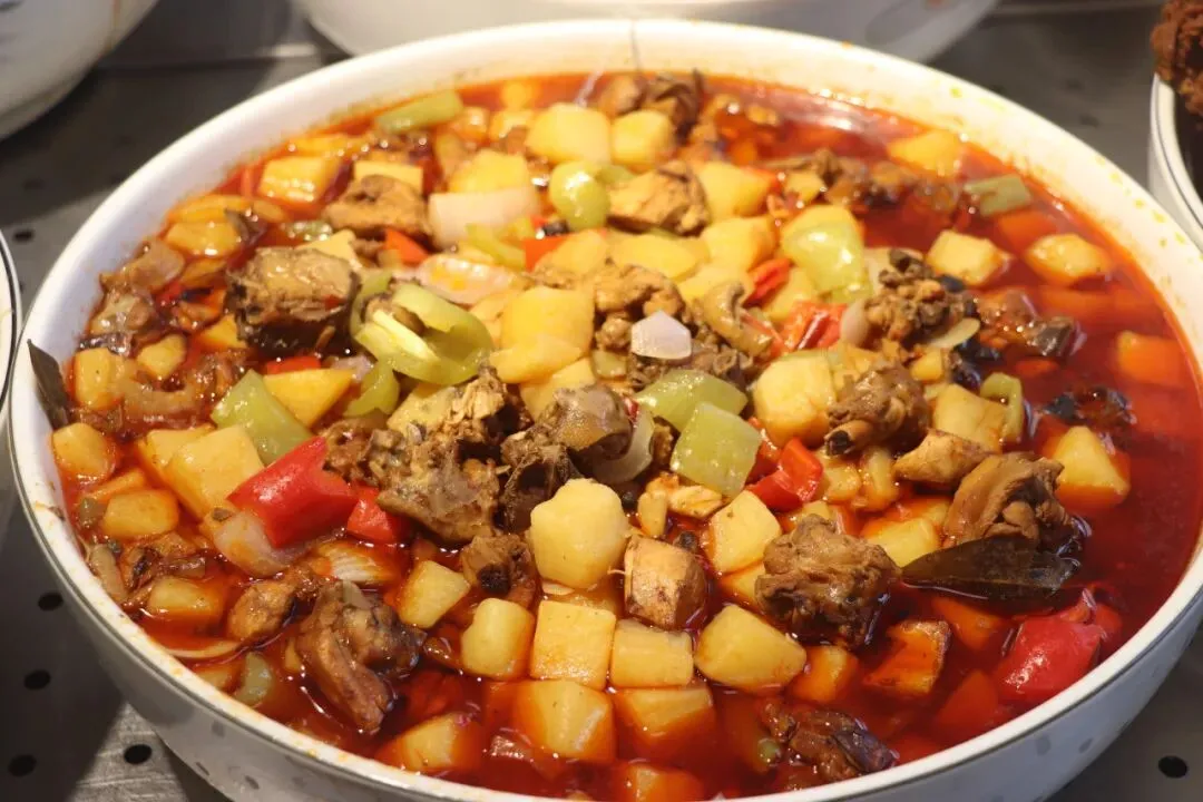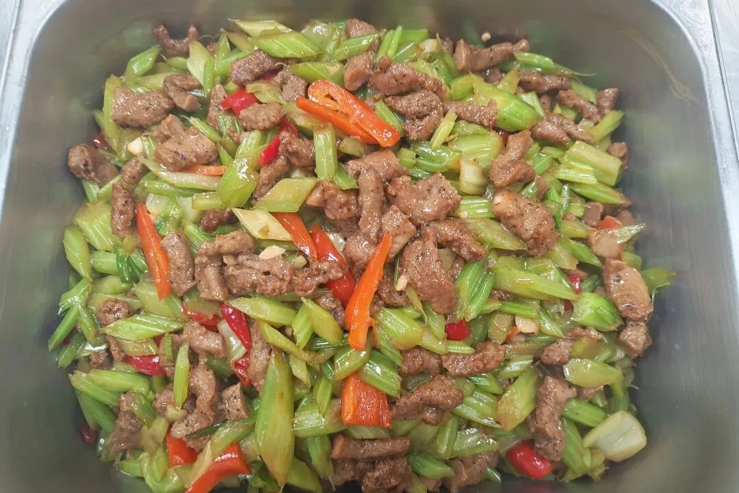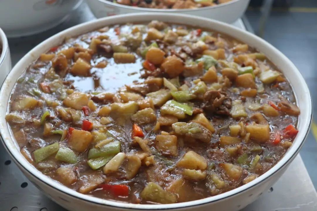 河南烩菜(肉60g豆腐20g白菜20g粉条20g)、啤酒鸭(土豆80g鸭块80g)、农家一碗香(青椒40g肉片80g荷包蛋40g)、干锅花菜(花菜80g肉80g)、豆腐小酥肉(豆腐80g肉80g)、蒸鸡腿(鸡腿70g)、手工鸡排(鸡肉70g)、蒜香青菜(小白菜100g)、酸辣绿豆芽(绿豆芽80g青红椒20g)