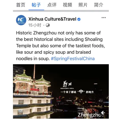 2月12日(初一),新华社Facebook文旅官方账号发布郑州“城市家书”