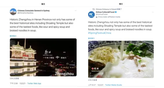 中国驻悉尼总领馆(左)和中国驻波兰大使馆Twitter官方账号转发郑州“城市家书”