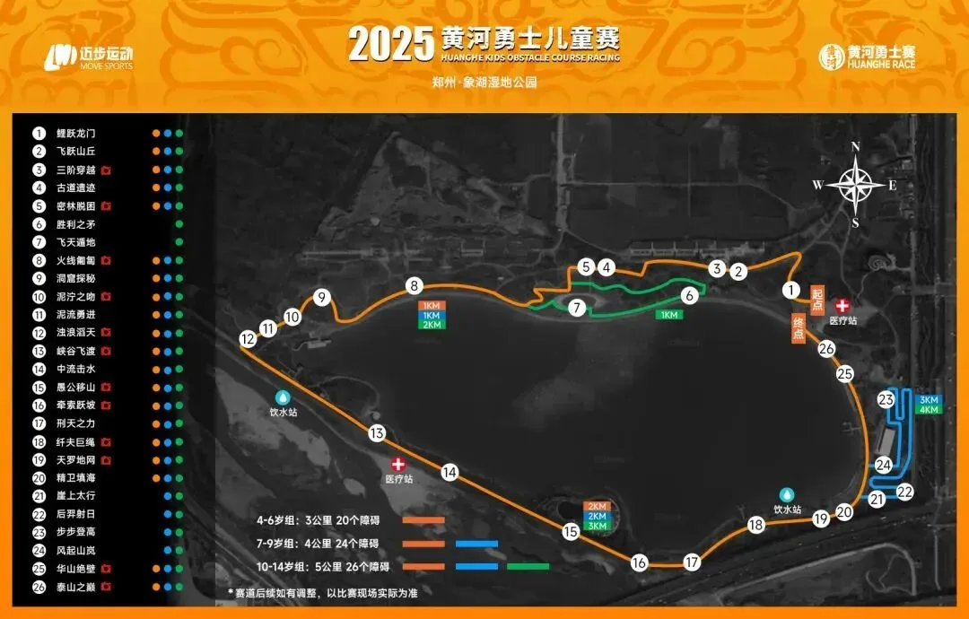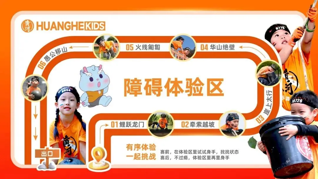 障碍分布在赛道沿途中,注意4-6岁、7-9岁和10-14岁三个年龄组的赛道路线的标识和指示,比赛时听从工作人员的指引,避免跑错赛道,具体的障碍可对照障碍解析来查看。