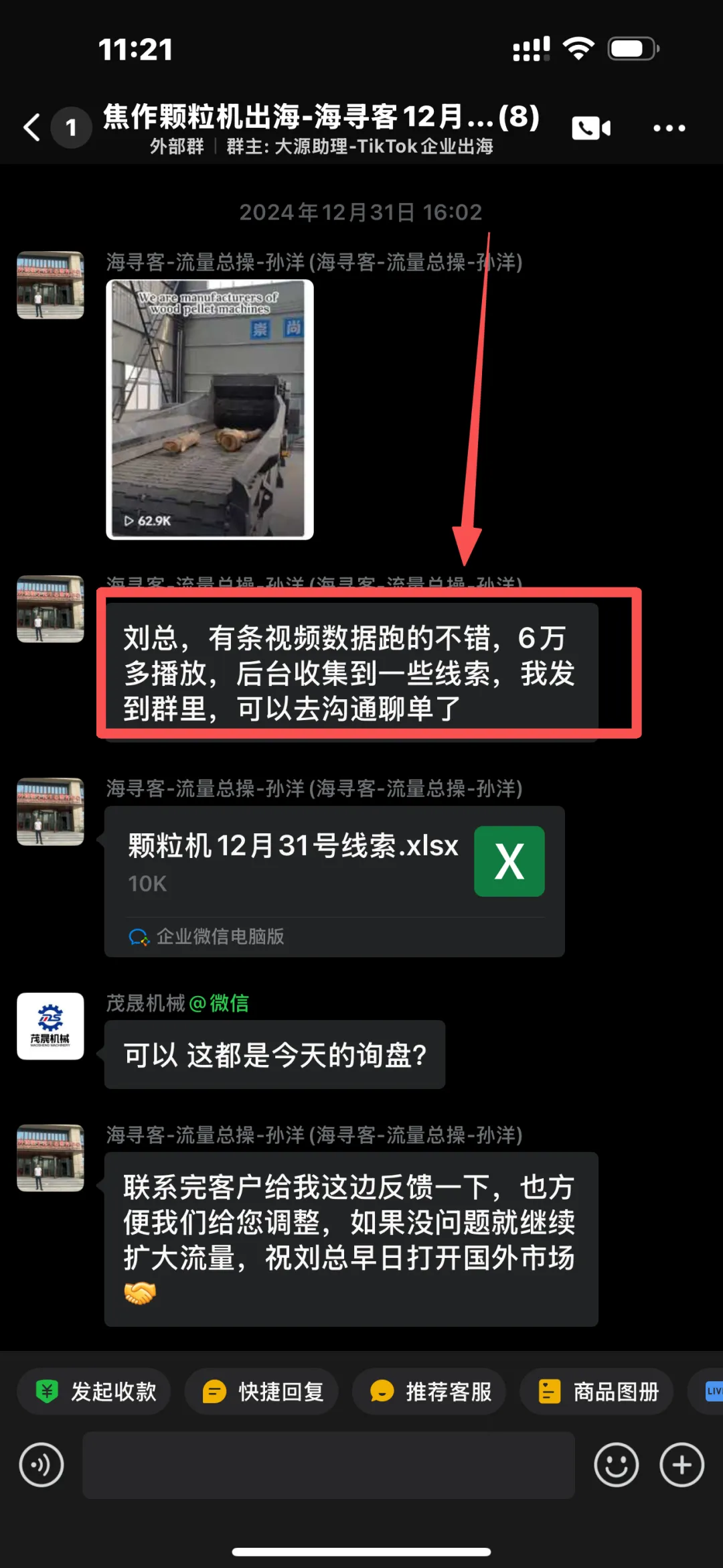 这是一家焦作的颗粒设备工厂,老板之前有接外贸公司的订单,只能等外贸公司分客户,了解到我们的宣传方式可以主动出击寻找客户及我们的服务内容后非常感兴趣,果断签约。