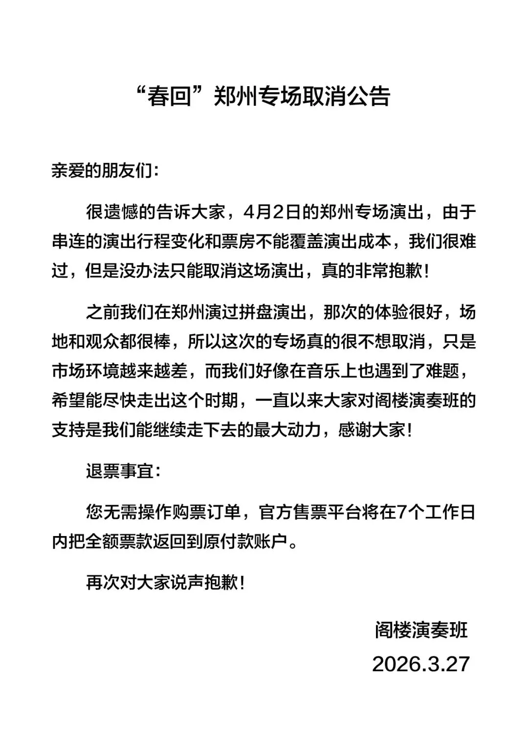 很遗憾的告诉大家,4月2日的郑州专场演出,由于串连的演出行程变化和票房不能覆盖演出成本,我们很难过,但是没办法只能取消这场演出,真的非常抱歉!