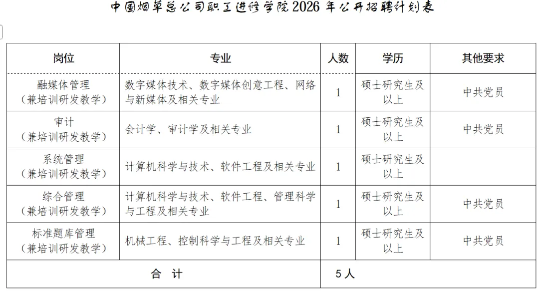 中国烟草总公司职工进修学院隶属于国家烟草专卖局、中国烟草总公司。国家烟草专卖局职业技能鉴定指导中心与进修学院合署办公,中国烟草总公司黄淮烟叶样品中心设立在进修学院。进修学院承担烟草行业高层次专业技术和职业技能人才培训、项目研发设计与组织实施、网络培训、教育培训资源建设、黄淮产区烟叶样品研究与管理、职业技能鉴定和职业技能竞赛工作。根据工作需要,面向社会公开招聘高校毕业生,现将具体事项公告如下: