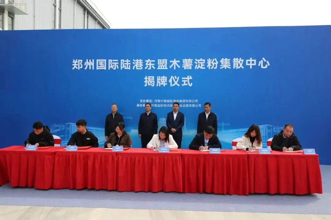 近日,郑州国际陆港东盟木薯淀粉集散中心在郑州国际陆港东作业区正式揭牌成立。省政府国资委党委委员、副主任李海峰,省商务厅二级巡视员周彤出席并为郑州国际陆港东盟木薯淀粉集散中心揭牌;中豫国际港务集团党委书记、董事长尹春华,郑州航空港区管委会二级巡视员刘书林出席并致辞。