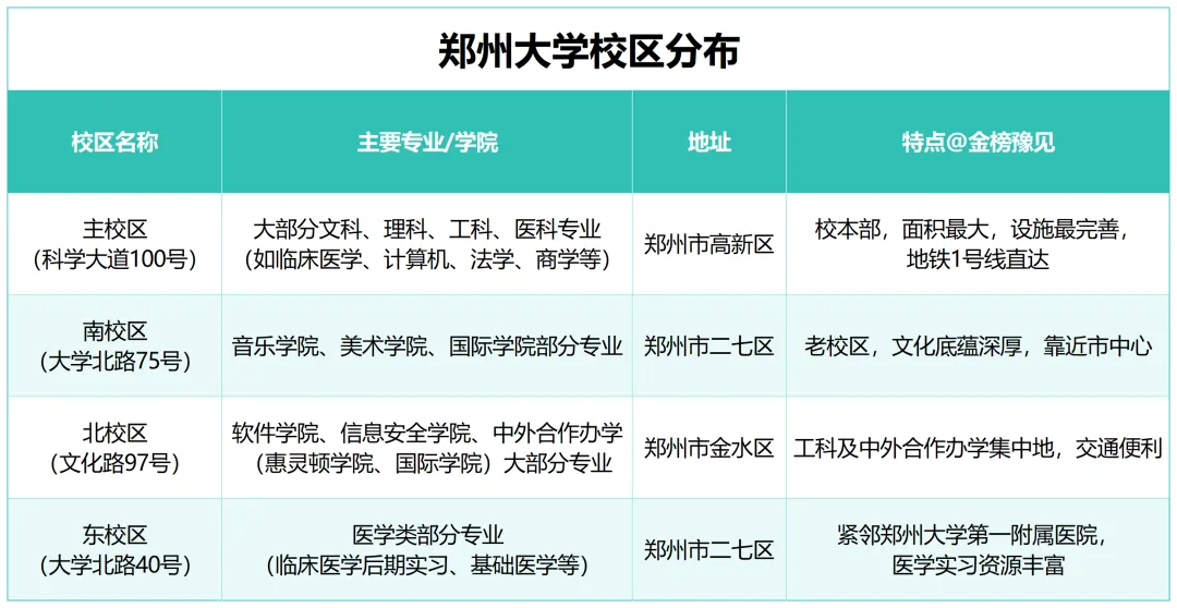 郑州大学目前有四个校区,不同专业分布在不同的校区,考生和家长在填报时一定要了解清楚,避免因校区位置影响就读体验。