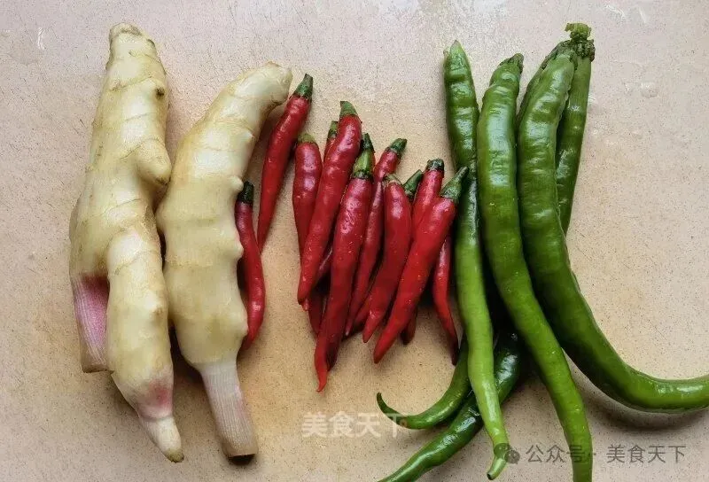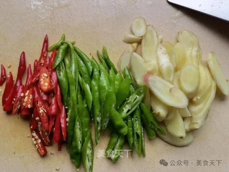 3. 小米椒和尖椒切斜丝,仔姜切斜片。