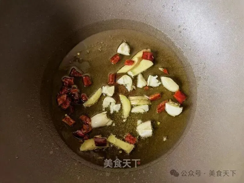 5. 锅里适量油烧热,姜蒜,辣椒炒香。