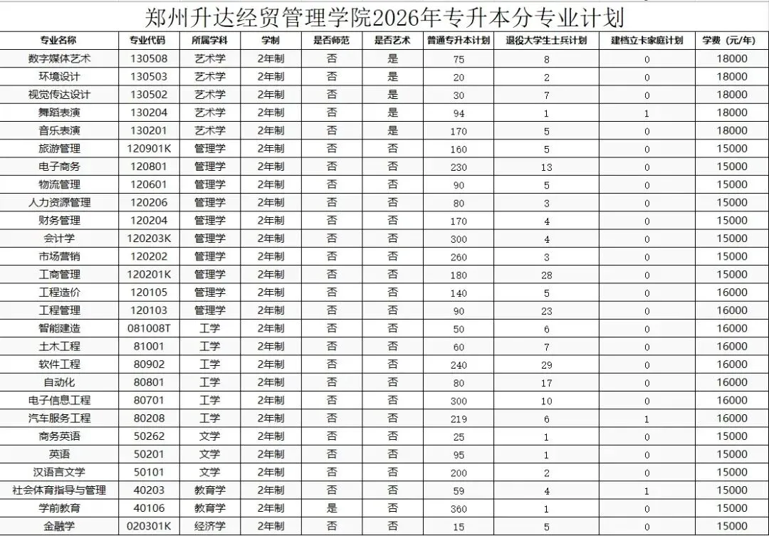 >郑州升达经贸管理学院公布2026年专升本招生计划