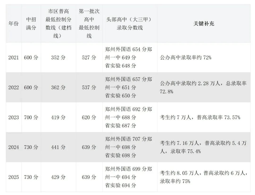 注:近5年郑州中招满分标准有调整(2022年600分、2023年700分、2024-2025年730分),分数不可直接横向对比,重点关注位次占比与相对趋势;以下数据以郑州市区公办高中为主,民办高中、县域高中分数仅供参考。