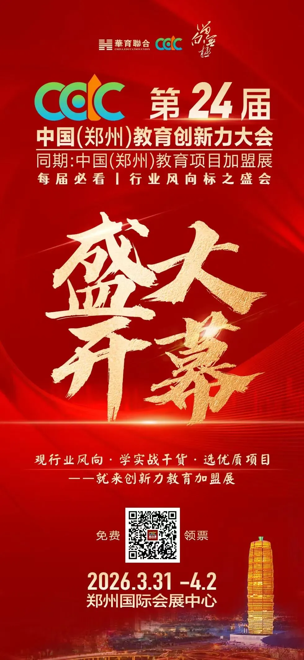 2026年3月31日,由华育联合展览、创新力会展携手行业专家、咨询师、一线讲师团队倾力打造的第24届中国(郑州)教育创新力大会暨教育项目加盟展,今日在郑州国际会展中心盛大启幕!大会以“留白·无极”为主题,以“趋势洞察、实战赋能、资源对接”为主线,设置一大主论坛、三大尊享赋能论坛、二大福利优选论坛、五大项目专场论坛、二大项目百家论坛的立体化矩阵,共呈现60+课题。汇聚全国百余位教育行业领袖、权威学者、一线实战操盘手与标杆机构创始人,以及200余家优质教育项目品牌,旨在为教培行业搭建一个集趋势洞察、实战赋能、资源对接于一体的高价值赋能平台,助力教培人在变革中找准方向、夯实内功、撬动增长曲线!