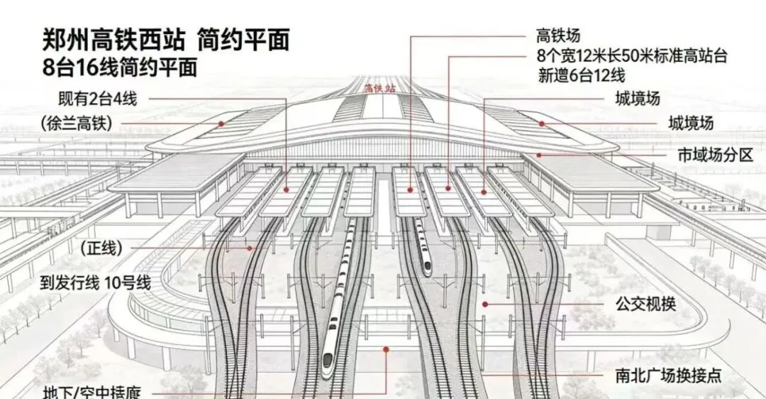 根据郑州市重点项目安排,郑州西站未来将迎来重磅改扩建,由目前2台4线直接扩容至8台16线,同步打造高铁枢纽产业、生态医养、轨道交通接驳等一系列配套,项目总投资约12亿元。