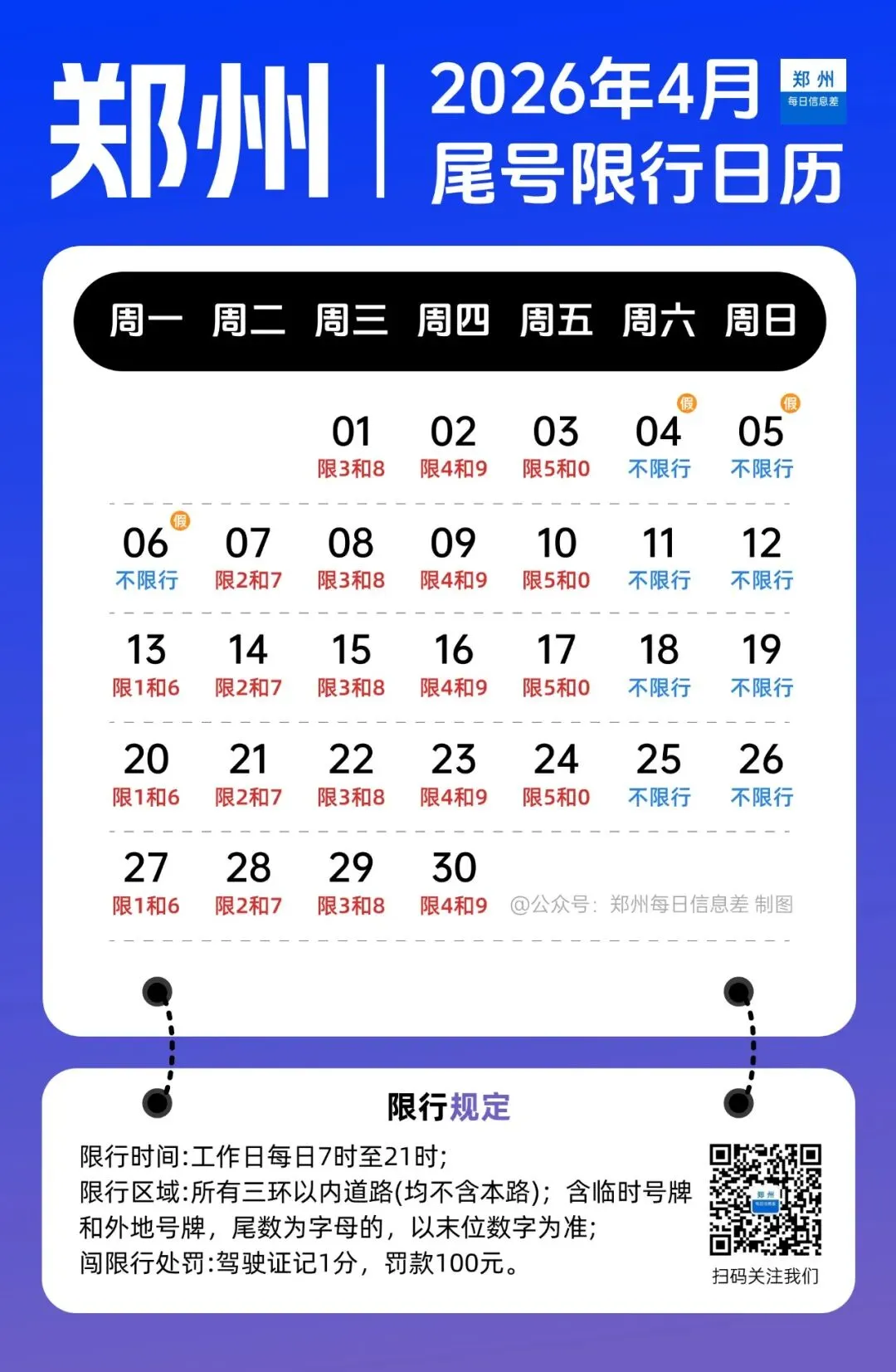 2026年4月限行尾号日历