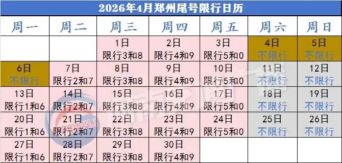 郑州4月限行尾号日历来了