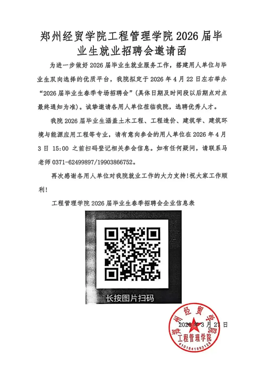 郑州经贸学院工程管理学院2026届毕业生就业招聘会邀请函