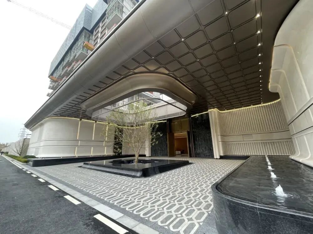山水和颂的大门百米宽一体化门廊,高7米,石材建标有了明显提升。比如纯铜大门、比如50年紫薇、克罗地亚米黄石材和马达加斯加蓝翡翠奢石。