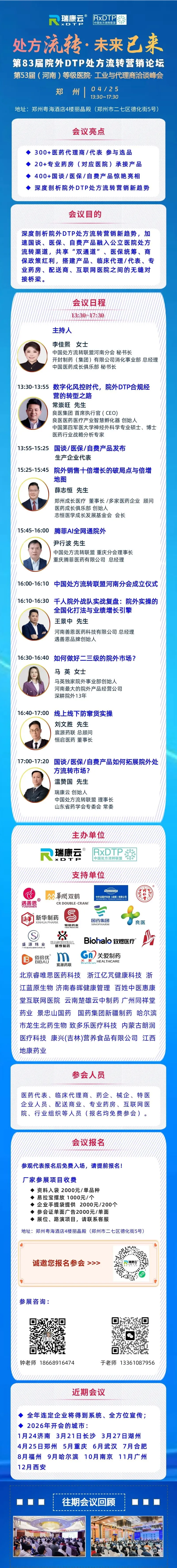 会议主题:第83届院外DTP处方流转营销论坛暨第53届(河南)等级医院· 工业与代理商洽谈峰会会议时间:4 月 25 日 13:30-17:30会议地点:郑州粤海酒店 4 楼丽晶殿(郑州市二七区德化街 5 号)参会福利:医药代表、临床代理商、药企、药房等行业人员免费报名参会!