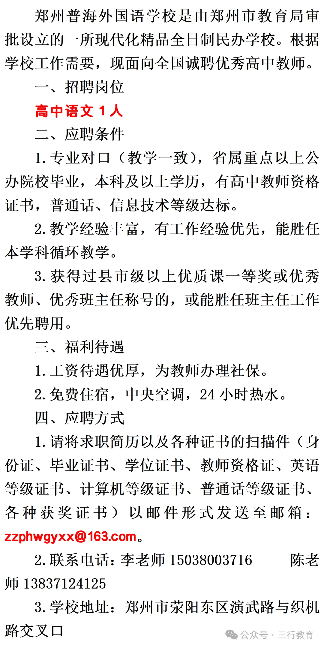 >郑州普海外国语学校诚聘优秀高中语文教师