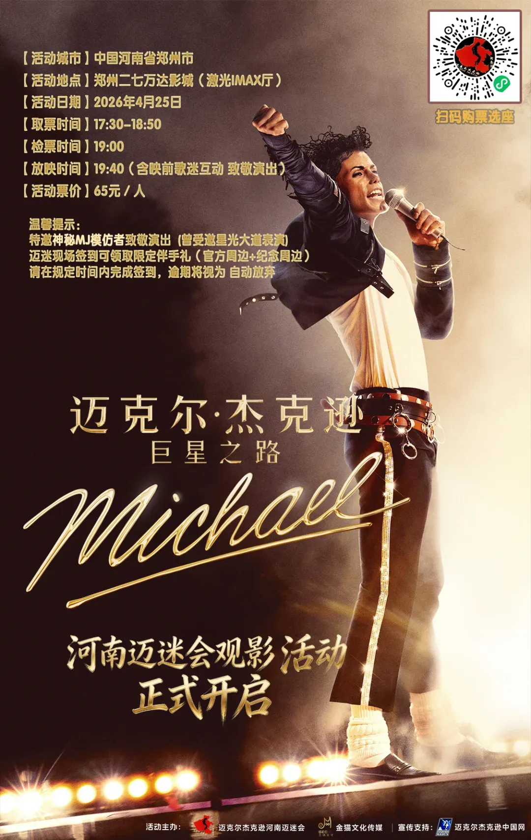 全球歌迷翘首以盼的MJ传记电影《迈克尔杰克逊:巨星之路》国内定档同步公映!上次全球影院上映的MJ纪录影片是2009年《就是这样》,时隔十七年,歌迷们再次齐聚世界各大影院,与我们的国王迈克尔杰克逊在大银幕重逢!迈克尔杰克逊河南迈迷会IMAX观影歌迷专场 火热售票!!这次我们选择合作的影院为郑州二七万达影城【激光IMAX厅】,为歌迷呈现迈克尔杰克逊音乐的极致视听体验!!购票即可获得IMAX官方海报+歌迷限定伴手礼,映前还有特邀MJ模仿者致敬演出+幸运歌迷抽奖,火速抢票锁座!!二七万达影城被影迷誉为河南区域口碑最佳的IMAX厅,拥有超大银幕搭配二代IMAX 12.0声道激光校准系统,每一处画面都亮场通透,每一个座位都是黄金位。超大银幕视野开阔,超清晰画质沉浸感十足;激光IMAX亮度为普通 IMAX 两倍,4K 分辨率 + 广色域,明暗细节仿佛身临其境;12.1 声道音响,动态范围大、定位细腻。活动地点:二七万达影城(河南省郑州市二七区大学南路与航海中路交叉口二七万达广场2号门4楼)取票时间:17:30-18:50(请按时到场出示购票凭证取票、领取伴手礼)映前互动:19:10-19:40(MJ致敬演出 幸运歌迷抽奖)温馨提示:本活动为歌迷专场,为保障活动正常进行,已售影票概不退款;活动当日请按时取票,逾期视为自动放弃。感谢配合!------------------------------MJ纪念铜像简介: