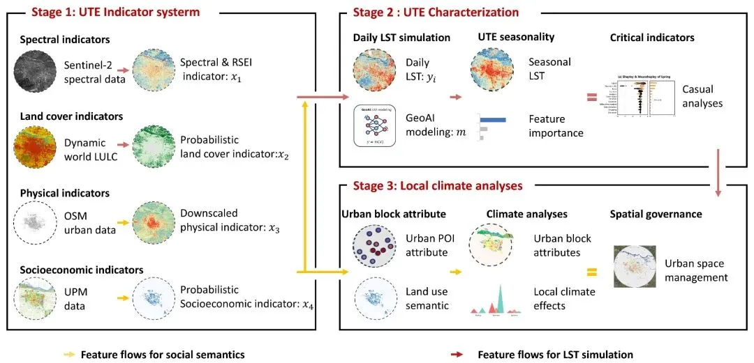 城市热环境研究对于应对气候变化、推进城市韧性治理具有重要意义。然而,传统研究多依赖物理特征与土地覆盖数据,对人类活动与城市物理环境交互作用背后的社会经济结构特征缺乏精细化表征。本研究创新性地挖掘城市规划图中蕴含的土地利用语义信息,构建了城市社会经济信息的无缝空间化表达框架,从而在广度和精度两个维度上显著提升了城市热环境的刻画能力。研究结果表明,社会经济指标在城市热环境建模中的贡献率达48.3%–54.6%,有效增强了模型对城市热环境空间差异的解释能力,为城市热风险治理与规划决策提供了有力的数据支撑。