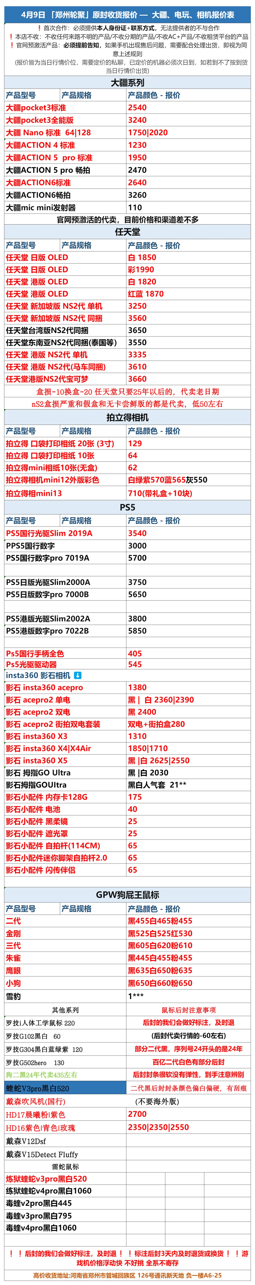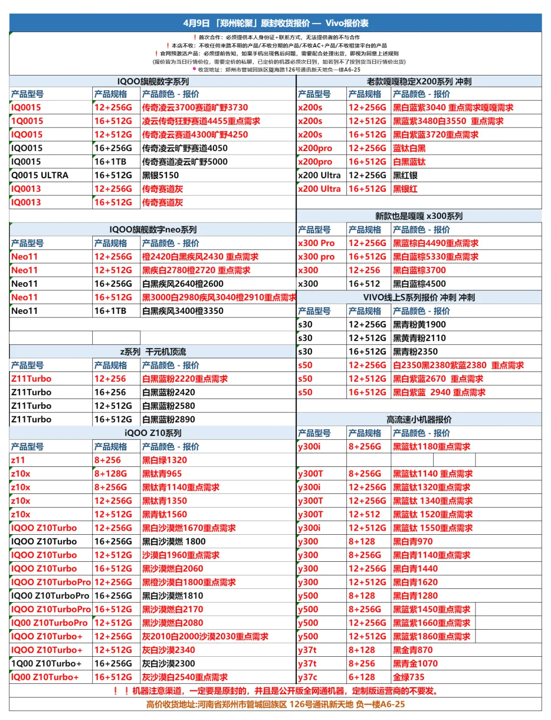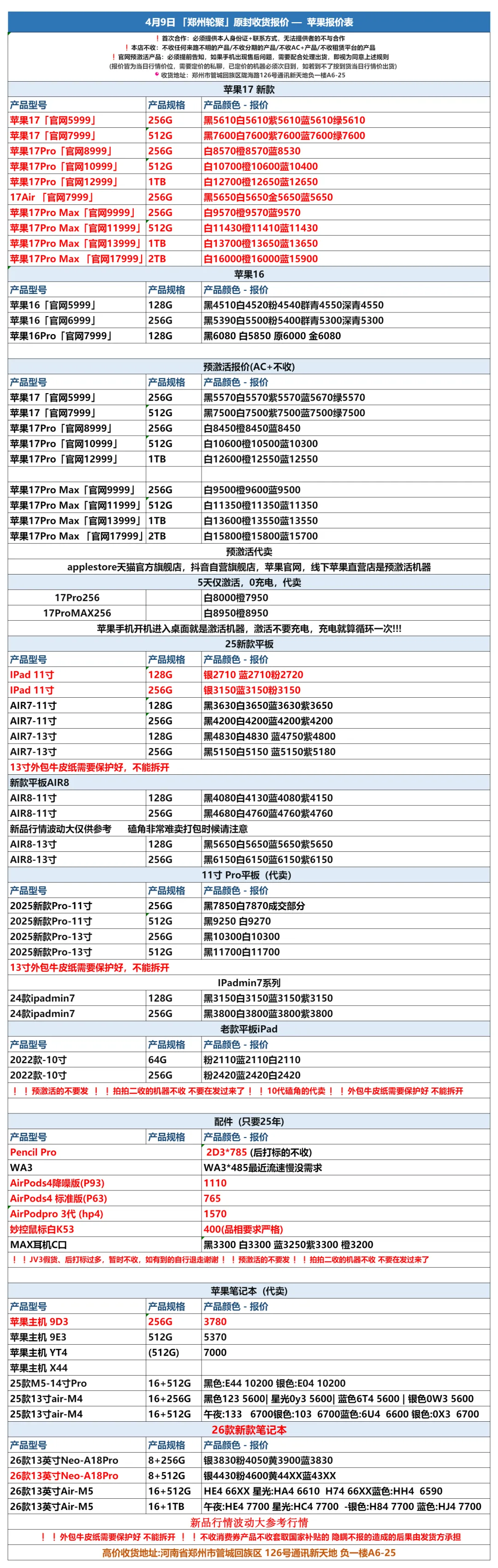 >郑州通讯新天地轮聚通讯 2026年4.9日数码报价更新