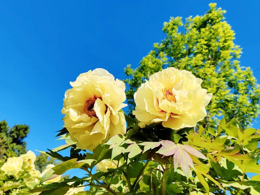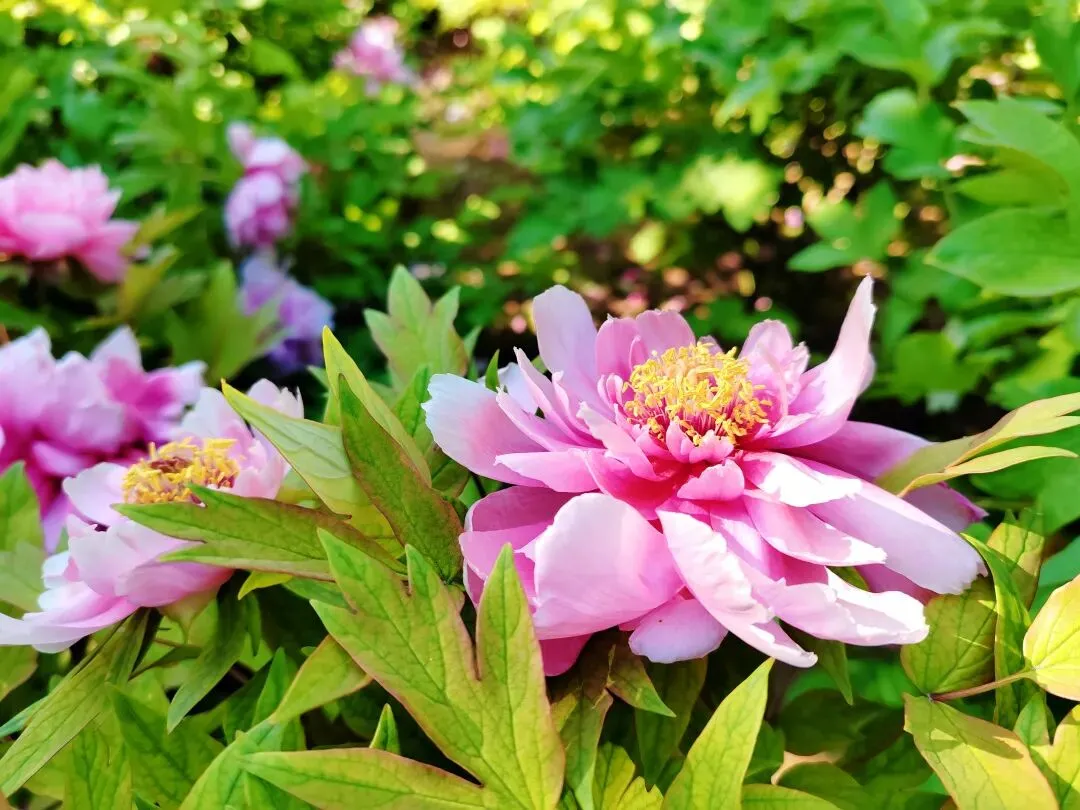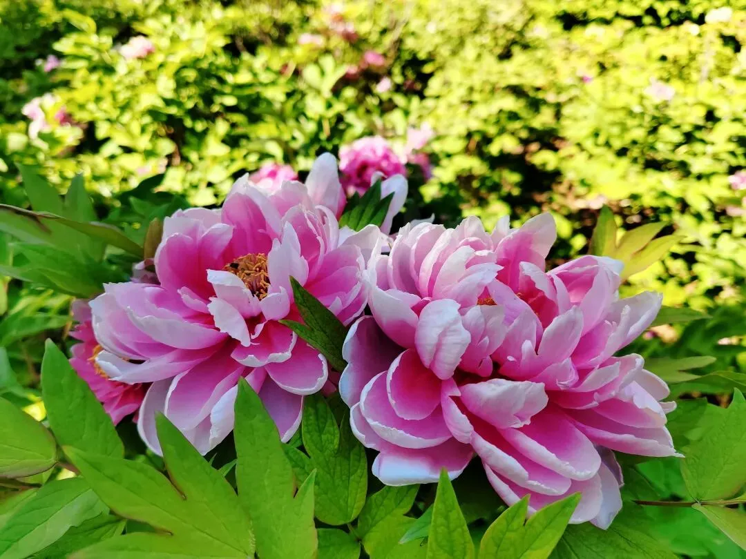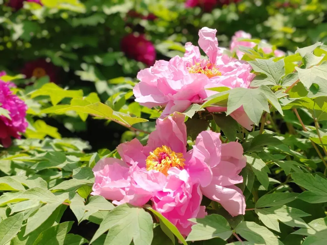 这里游客不多,牡丹确也开得茂盛,花朵娇艳、花色清新,与园内的参天古木、原生植被相互映衬,既有牡丹的雍容,又有森林的静谧,仿佛闯入了世外桃源。