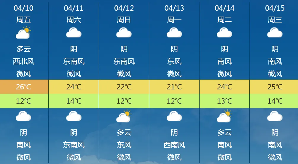 郑州市天气预报,今天:晴天间多云,偏北风转偏南风2-3级,最低气温:13~14℃,最高气温:25~26℃。11日:多云转阴天,12~24℃。