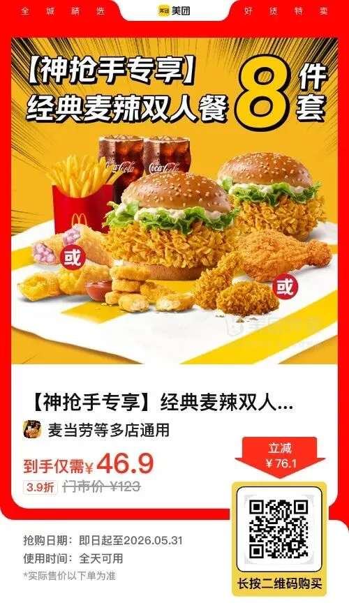 郑州的麦门信徒看过来!🔥麦当劳外卖放大招,46.9元抢原价123元经典麦辣双人8件套~