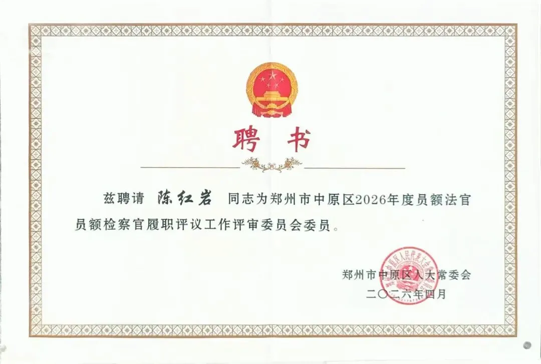 员额法官、员额检察官履职评议作为检验司法作风、履职能力的“尺子”,是加强法检队伍建设的一项重要载体,也是提高司法公信力的重大举措。陈红岩律师连年被聘请为郑州市中原区员额法官、员额检察官履职评议工作评审委员会委员,是对我所律师专业法律服务能力、政治素养的高度认可。