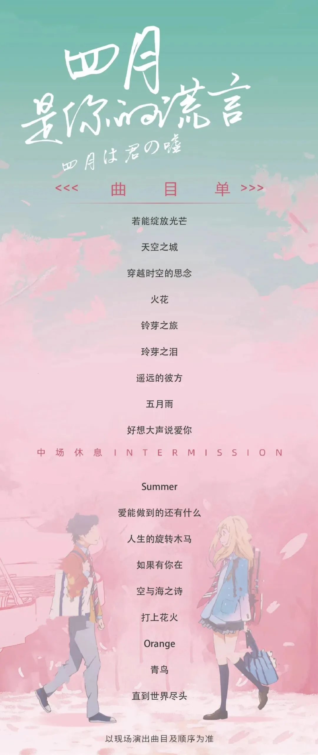 本场音乐会精心挑选了《四月是你的谎言》及热门动漫中最具代表性的配乐,带你回味那些陪伴我们度过无数个感动瞬间的背景音乐。