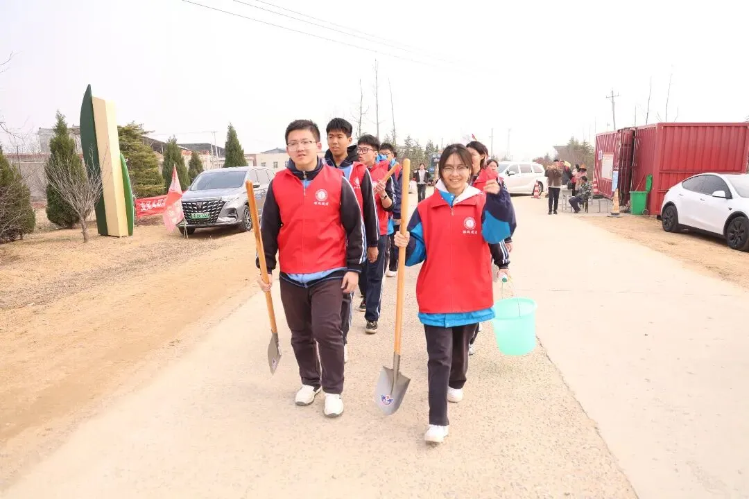 下午1时,阳光和煦,校门口身着红色志愿马甲的学生志愿者们整装待发。他们精神抖擞,脸上洋溢着期待与热情。团委副书记孙梦凯在出发前作动员讲话:“今天我们种下的不仅是一棵树,更是一份责任、一份希望。希望同学们在劳动中感悟生命的力量,在实践中传承生态文明理念。”随后,载着工具的大巴缓缓驶出校门,鲜红的团旗迎风招展,青春的朝气与春日的暖阳交相辉映。