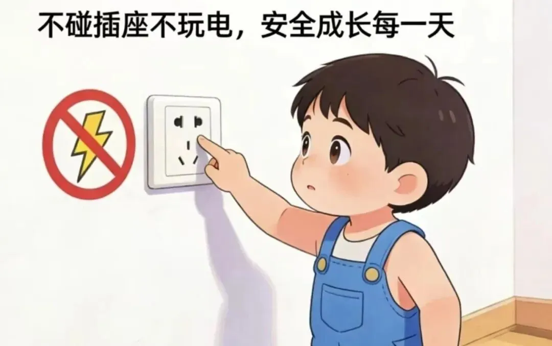 家里墙上的插座、桌上的插线板,有很多小圆孔。千万不能用小手、铅笔、铁丝、钥匙去戳、去塞,会触电受伤哦!