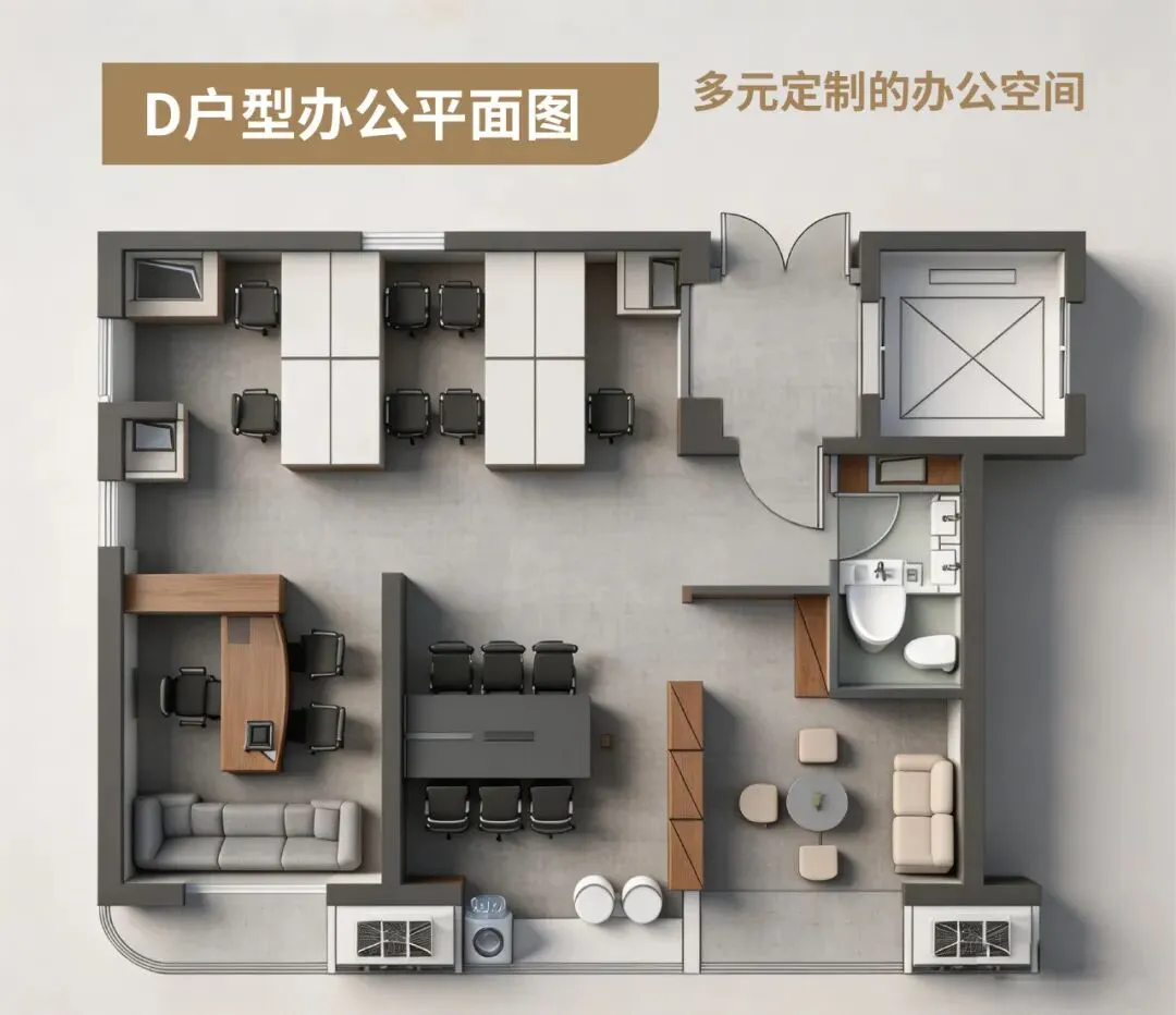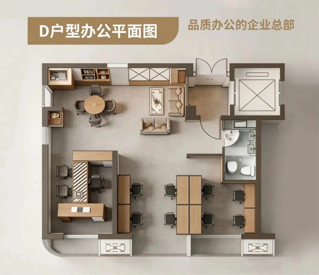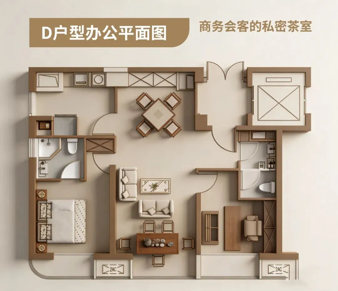 同时双气三房也可改造专属规划的私密茶室,为高阶商务往来补齐了极具分量的社交价值拼图,成为这套商务解决方案里的点睛之笔。