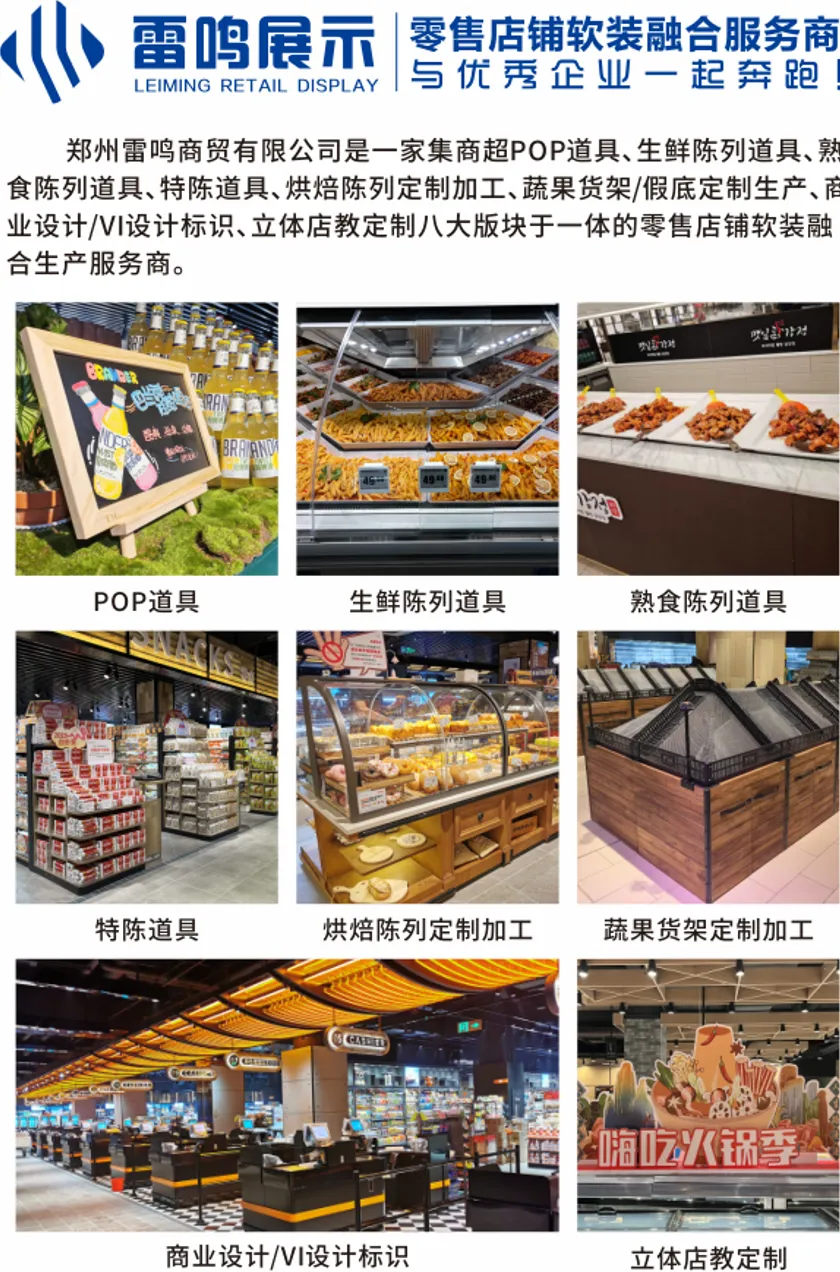 本届CHINASHOP,郑州雷鸣道具将以6号馆6B79展位为窗口,着重展出熟食加工陈列道具与试吃道具、蔬果区木质货柜与配套道具、食百木质美陈、商超标识导视、立体文案店教、全系列亚克力定制产品、全系列包装耗材。提供一站式商超解决方案。