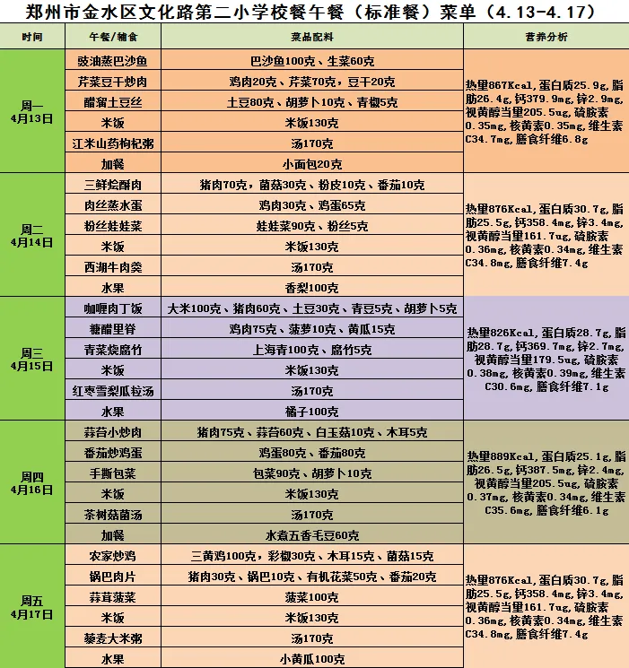 健康饮食是孩子成长的根基,我们秉持着学生膳食“安全、均衡、营养”的原则,根据季节挑选时令蔬菜、肉蛋、水果、谷物等新鲜食材,制定每周营养食谱,精心烹饪学生的每一餐。让我们一起来看看本周的食谱吧!
