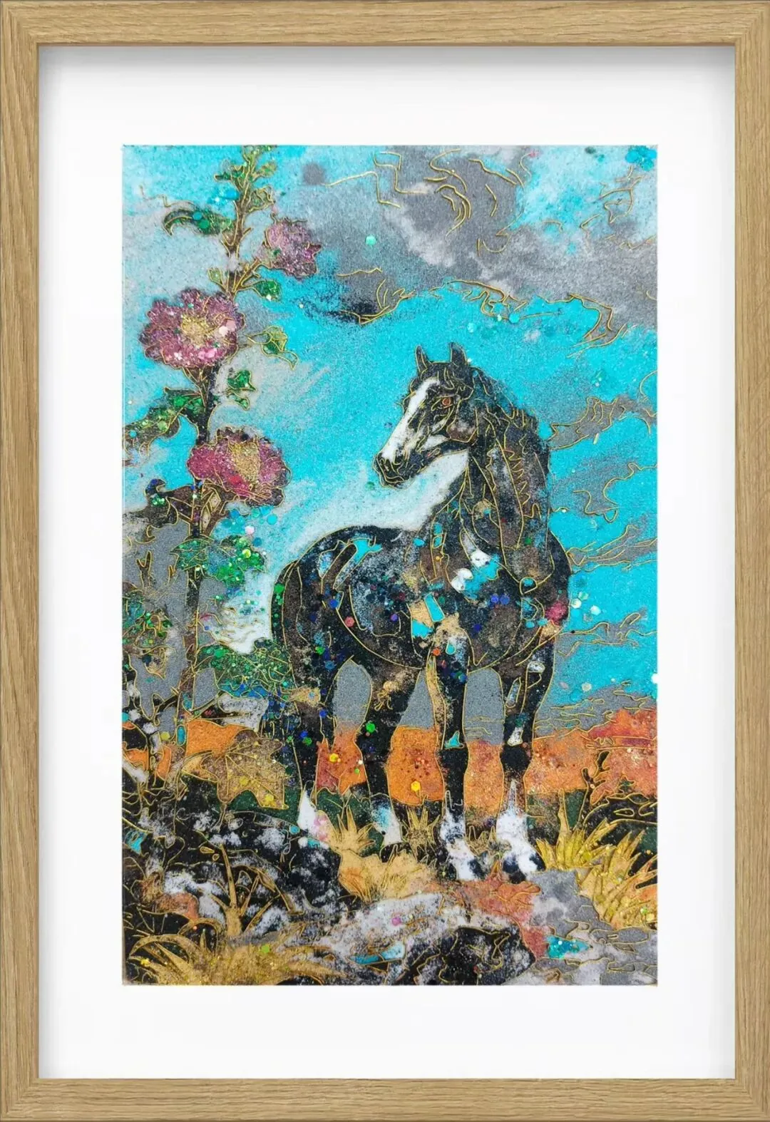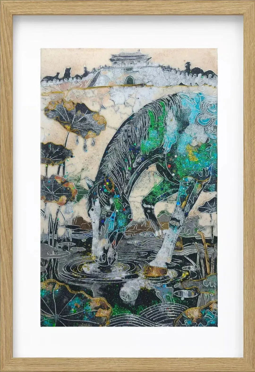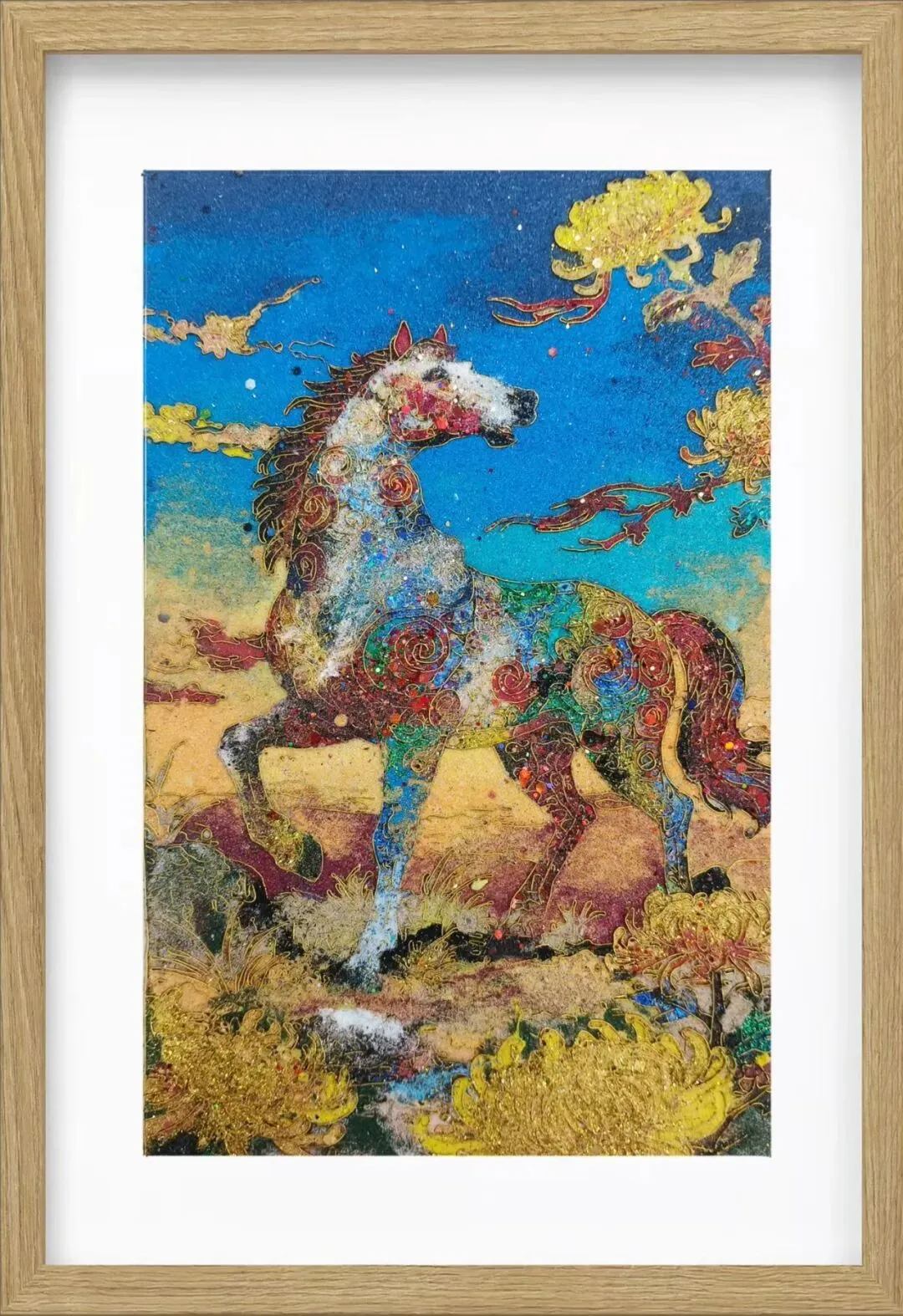 用岩彩浓淡晕染名马神骏。