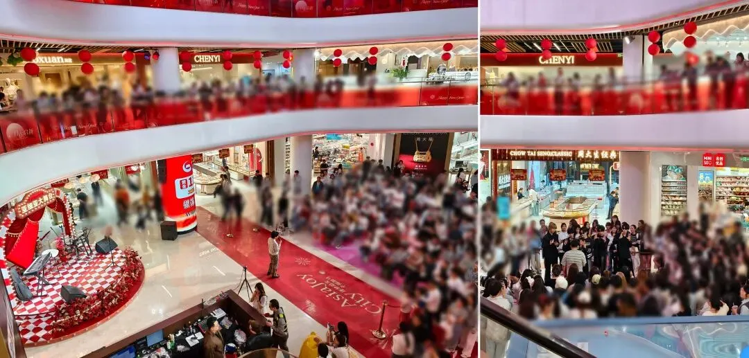 商场一楼中心位置,每逢节假日都会有各种演出和网红表演,吸引大批游客驻足观看,气氛热烈。商场每一层楼都沿着中庭设置了一圈座椅,方便各楼层的游客休息,同时俯瞰楼下的演出。