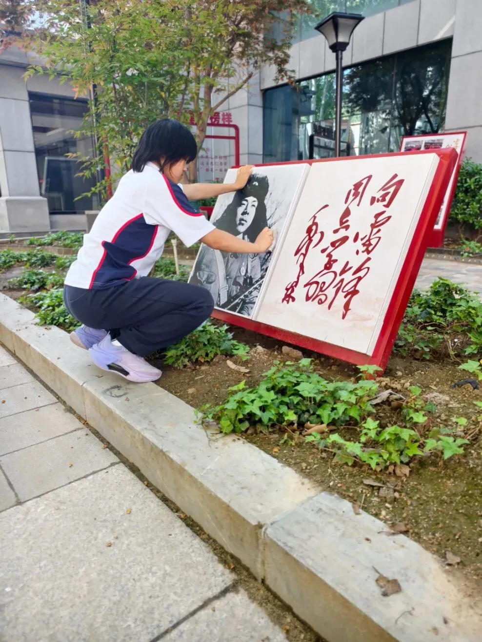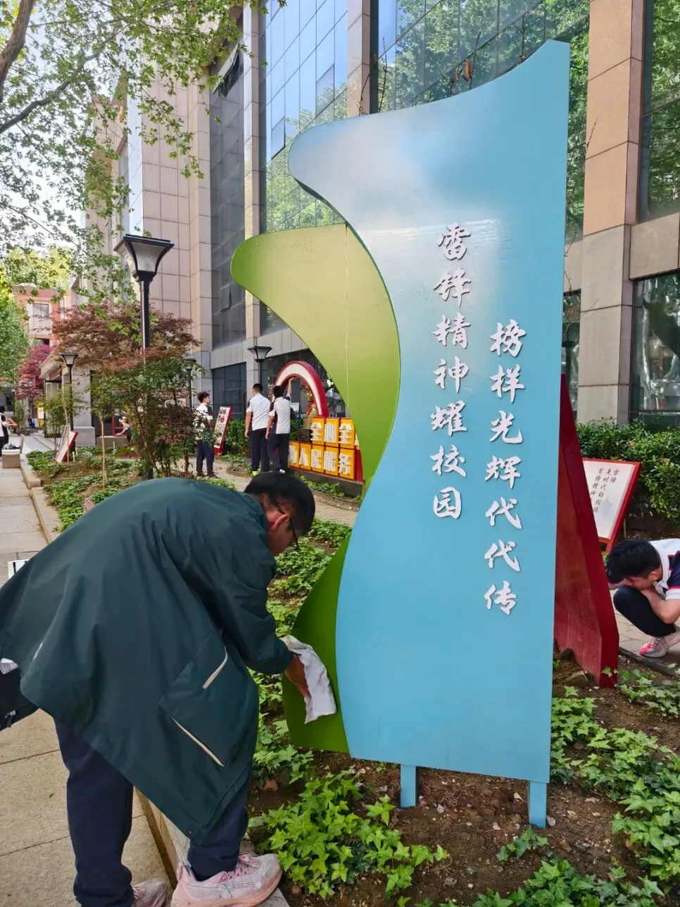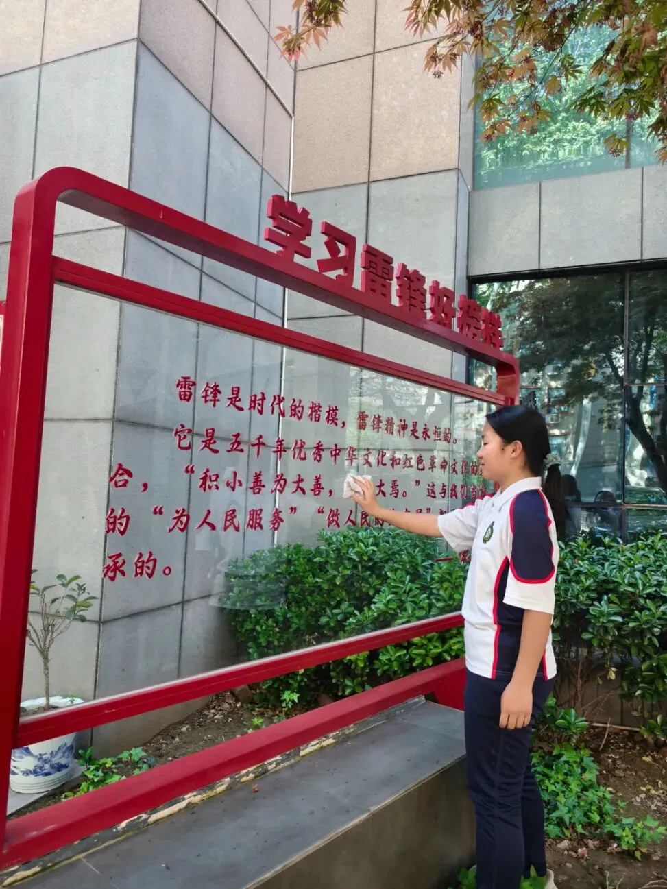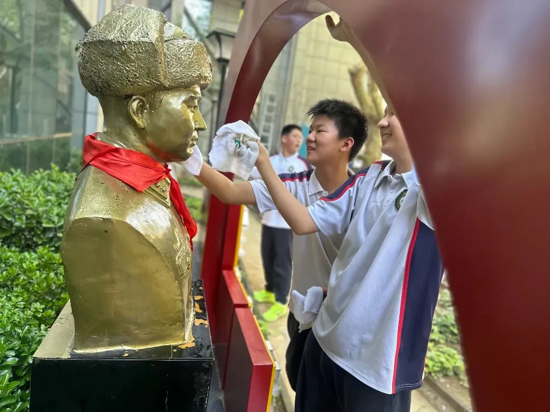 擦拭过程中,同学们神情专注,一边用心清洁,一边回忆老师讲述的雷锋同志的感人事迹,在动手实践中近距离感悟“无私奉献、爱岗敬业、乐于助人”的雷锋精神内涵。原本布满灰尘的雕像焕然一新,鲜红的红领巾在阳光下熠熠生辉,一块块整洁的展板、一个个鲜亮的标识,不仅美化了校园环境,更让雷锋精神在同学们心中深深扎根。