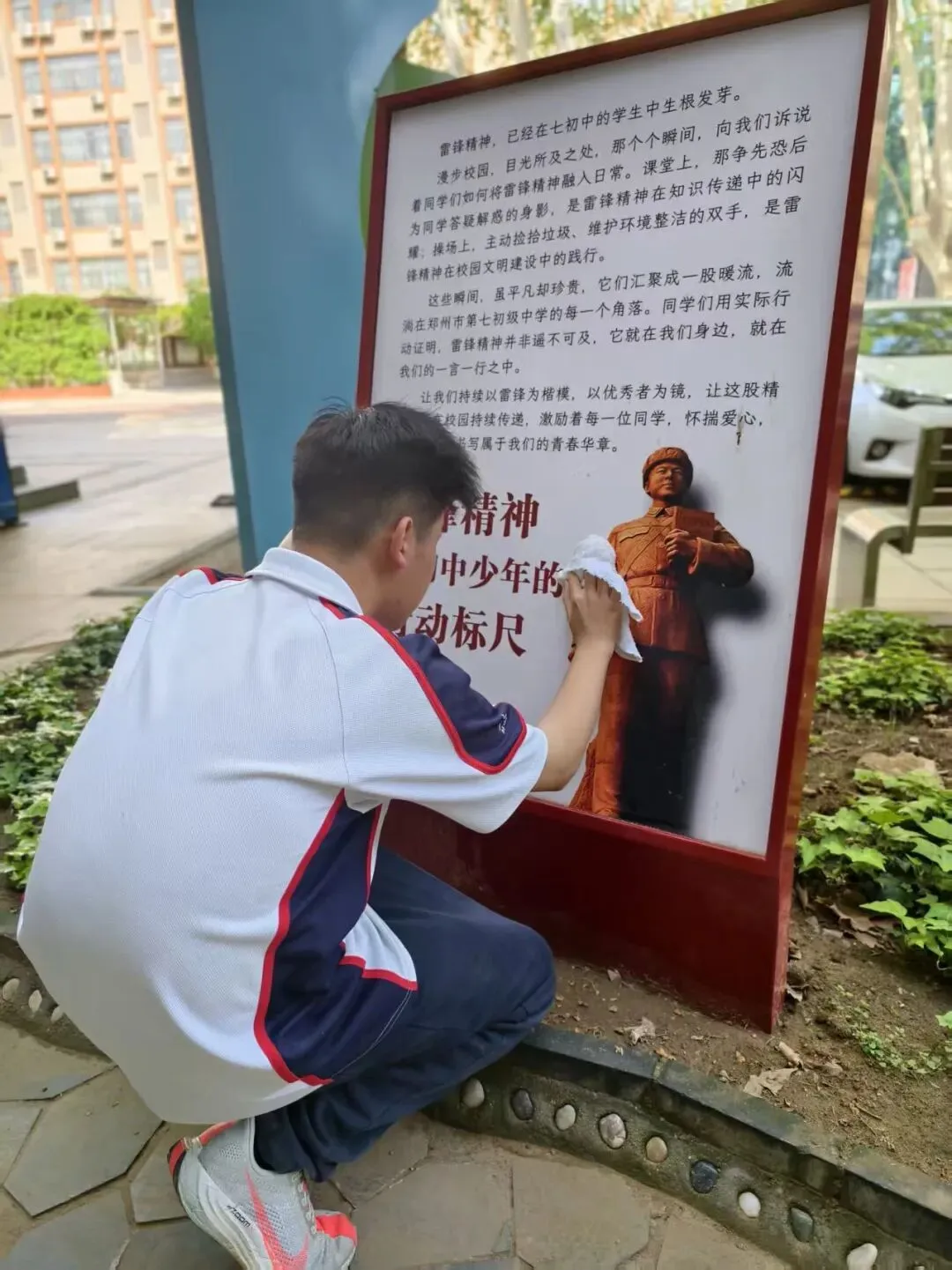 为深入学习贯彻雷锋精神,引导学生在实践中感悟奉献真谛,厚植爱国情怀,近日,郑州市第七初级中学八一班组织开展“学雷锋 树新风 争做文明好少年”主题实践活动。同学们走进校园雷锋文化广场,以亲手擦拭雷锋雕像、为雕像系上鲜红红领巾、清洁主题展板的实际行动,致敬雷锋同志,让雷锋精神在七初校园里薪火相传。