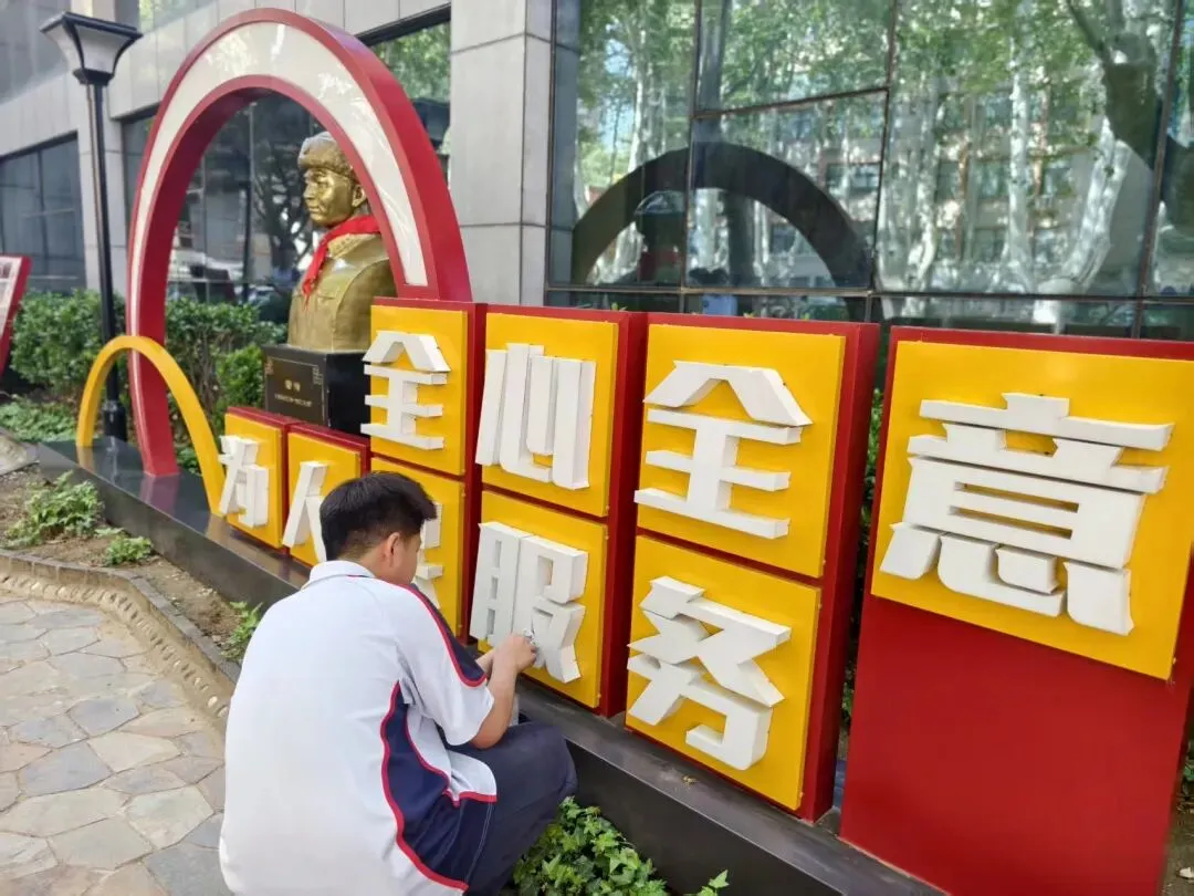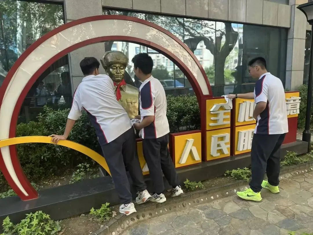 活动现场,同学们热情高涨、分工明确。大家手持抹布、水桶等清洁工具,认真细致地擦拭雷锋雕像的每一处细节,从金色的铜像到红色的基座,不放过任何一处灰尘;随后,同学们神情庄重地为雷锋雕像系上鲜红的红领巾,以少先队员最崇高的礼仪,向榜样致以最诚挚的敬意。同时,同学们还对校园内“全心全意为人民服务”主题标识、雷锋精神宣传展板、文化景观牌等进行了全面清洁。