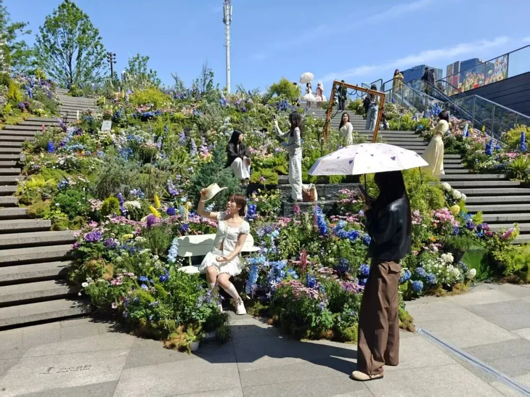 在郑东万象城3号门下沉广场,雏菊、风铃草、绣球等花卉均已绽放。色彩缤纷的花丛间,拱形镜面、复古相框等打卡点错落有致地分布其中,吸引大批市民游客驻足拍照。市民李女士告诉记者,这已经不是自己第一次来这里了,每次过来拍完照之后心情都会变得特别好。