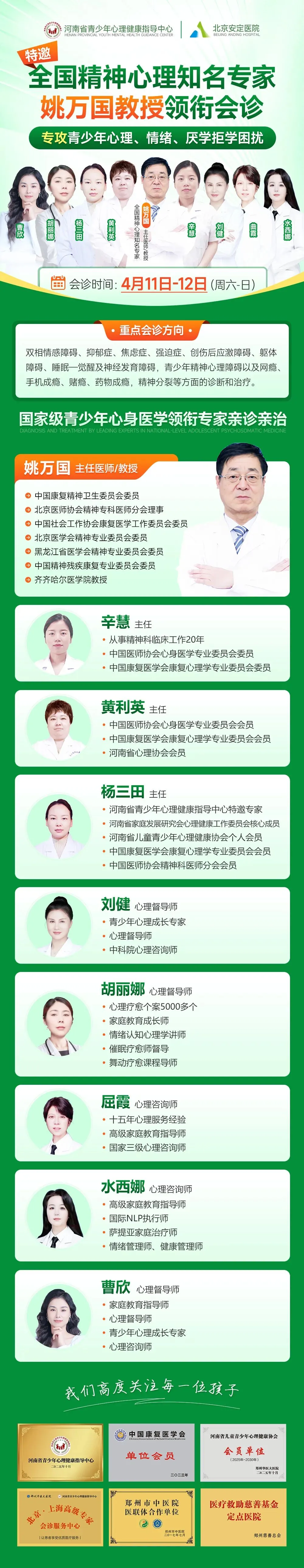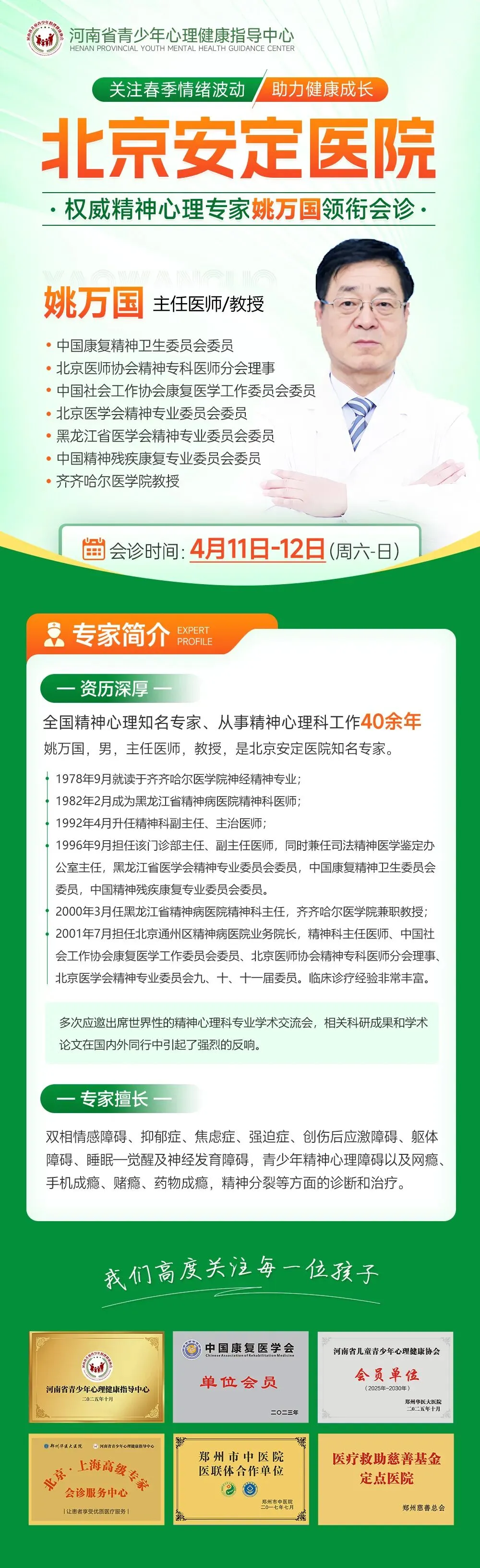 青春期是青少年心理发展的关键阶段,学业压力、社交困惑、情绪波动等问题,常常成为成长路上的“拦路虎”。为让河南青少年在家门口就能享受国家级优质心理诊疗资源,破解心理困境,4月11日—12日,河南省青少年心理健康指导中心特邀北京安定医院知名专家姚万国教授亲临我院,开展专项会诊活动,为青少年心理健康保驾护航。