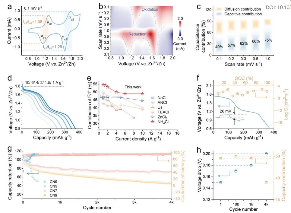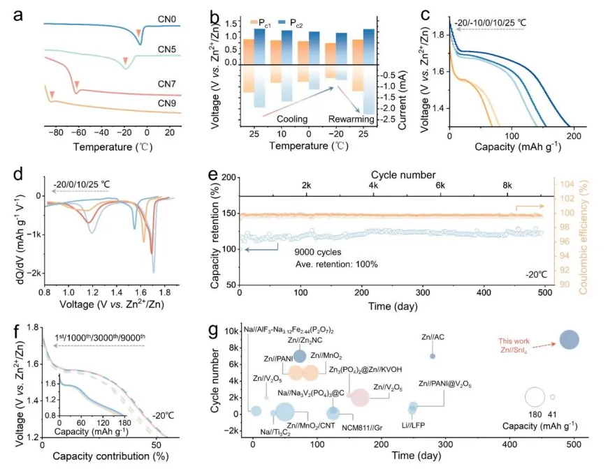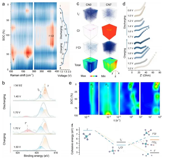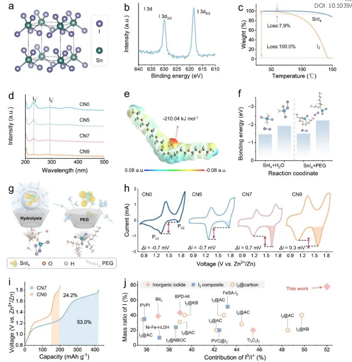 水系锌碘电池安全、低成本、高容量,是大规模储能理想体系,但传统碘正极仅能发生两电子转化(I⁻/I⁰),容量受限;若想实现四电子转化(I⁻/I⁰/I⁺),则高价态 I⁺极易被水分子亲核攻击发生不可逆水解,同时多碘化物穿梭效应严重。低温环境下,电解液氢键网络结冰、离子传输冻结,I⁺转化动力学进一步恶化,导致电池容量暴跌、循环崩溃,难以实现宽温域、长寿命、全四电子转化。现有策略无法同时解决 I⁺不稳定、多碘化物穿梭、低温动力学差三大难题。本研究首创竞争溶剂占据(CSO)策略,以聚乙二醇(PEG)重构电解液氢键网络,通过熵驱动氢键重组与脱溶剂动力学调控,稳定 I⁺中间相,实现近乎完全的四电子转化(转化深度 97.2%)。同时构建SnI₄共价稳定型正极,碘负载量高达 81.1%。电池在 - 20 ℃超低温下实现495 天(11890 小时)零容量衰减,1.55 V 高压平台稳定输出,突破水系锌碘电池低温与转化深度瓶颈。①设计理念创新:首次提出竞争溶剂占据(CSO)新策略,重构氢键网络,从热力学与动力学双维度稳定高价 I⁺,实现完全四电子转化;②作用机制创新:PEG 优先占据溶剂化层,破坏水分子长程有序结构,抑制水诱导 I⁺水解,同时加速低温质量 / 电子转移;③性能突破:实现97.2% 理论转化深度、410.2 mAh g⁻¹ 高容量、-20 ℃下 495 天超长循环,高压平台(1.68 V)贡献超 51.7% 容量。图 1. (A) SnI₄晶体结构;(B) I 3d 高分辨 XPS 谱;(C) SnI₄与 I₂热重分析;(D) 不同电解液中 UV-Vis 光谱;(E) PEG 静电势分布;(F) 结合能对比;(G) 稳定性机制示意图;(H) 不同电解液 CV 曲线;(I) 充放电曲线对比;(J) 活性碘质量比与 I⁰/I⁺贡献对比。①结构稳定:SnI₄共价键牢固,碘含量 81.1%,热稳定性远超单质 I₂;②界面稳定:PEG 与SnI₄结合能(-2.23 eV)强于水(-1.46 eV),抑制水解与多碘化物生成;③性能飞跃:实现 97.2% 四电子转化深度,容量 410.2 mAh g⁻¹,1.68 V 高压平台贡献 51.7% 容量。图 2. (A) 不同电解液拉曼光谱;(B) ¹H NMR 谱;(C) 氢键作用能;(D) Zn-O 与 Zn-Cl 径向分布函数;(E) Zn²⁺-H₂O 配位数;(F) Zn K 边 XANES 谱;(G) FT-EXAFS 小波变换;(H) 锌负极 (002) 极图。①氢键重构:PEG 大幅削弱强氢键水比例(50%→3%),形成紧致稳定氢键网络;②溶剂化调控:Zn²⁺第一溶剂化层水分子显著减少,Zn-O (PEG) 强配位,脱溶剂能垒降低;③沉积优化:诱导锌择优取向 (002) 生长,无枝晶、无副产物,界面高度稳定。图 3. (A) CN7 电解液 CV 曲线;(B) 不同扫速 CV 等高线图;(C) 电容与扩散贡献比例;(D) 不同电流密度放电曲线;(E) I⁰/I⁺容量贡献对比;(F) GITT 曲线与扩散系数;(G) 长循环性能;(H) 电压降与 I⁰/I⁺贡献演变。①双平台稳定:1.19 V(I⁻/I⁰)与 1.68 V(I⁰/I⁺)双平台,高压平台贡献近半容量;②动力学优异:离子扩散系数 3.89×10⁻⁸ cm² s⁻¹,极化低至 26 mV;③超长循环:2 A g⁻¹ 下循环 4000 圈,平均每圈衰减仅 0.0031%,库仑效率 97.5%。图 4. (A) 充放电曲线与原位拉曼等高线图;(B) 不同电压下 I 3d XPS 谱;(C) TOF-SIMS 三维重构;(D) 异位 EIS 曲线;(E) 弛豫时间分布;(F) 内聚能计算。①原位证据:充电 I⁻→I⁰→I⁺,放电 I⁺→I⁰→I⁻,全程可逆无副产物;②界面稳定:I⁺以ICl⁻形式稳定存在,无穿梭、无水解,界面阻抗全程低位稳定;③热力学稳定:I⁺-Cl⁻内聚能 - 6.53 eV,远高于无配体状态,转化高度可逆。图 5. (A) 不同电解液 DSC 曲线;(B) 不同温度下 CV 峰电位与电流;(C) 不同温度放电曲线;(D) dQ/dV曲线;(E) -20 ℃长循环;(F) 不同循环放电曲线;(G) 低温性能对比。①抗冻特性:CN7 电解液无明显结晶峰,-20 ℃仍保持良好流动性;②低温性能:-20 ℃下仍保持 1.55 V 高压平台,容量无衰减;③超长寿命:-20 ℃稳定循环495 天(11890 小时)、9000 圈,容量保持率 100%。本研究提出竞争溶剂占据(CSO)全新策略,通过聚乙二醇重构电解液氢键网络,调控溶剂化结构,稳定高价碘中间相,实现水系锌碘电池近乎完全的四电子转化(97.2%)。CSO 策略抑制 I⁺水解与多碘化物穿梭,加速低温离子 / 电子转移,使电池实现 410.2 mAh g⁻¹ 高容量,1.68 V 高压平台贡献 51.7% 容量;并在 - 20 ℃极端低温下实现495 天(11890 小时)零容量衰减。该工作突破了水系卤素电池高价态不稳定、低温性能差的核心瓶颈,为高能量密度、宽温域、长寿命水系储能电池提供全新设计原理。anti-freezing aqueous zinc-iodine batteries. Energy & Environmental Science, 2026; https://doi.org/10.1039/D6EE00755D本文内容来源于学术研究论文,版权归原作者所有。转载旨在分享学术成果,仅供参考,不构成任何应用建议。如涉及作品内容、版权或其他问题,请及时联系处理。