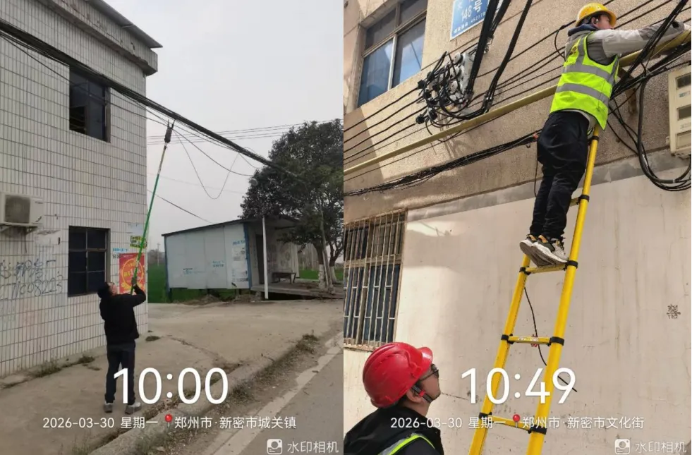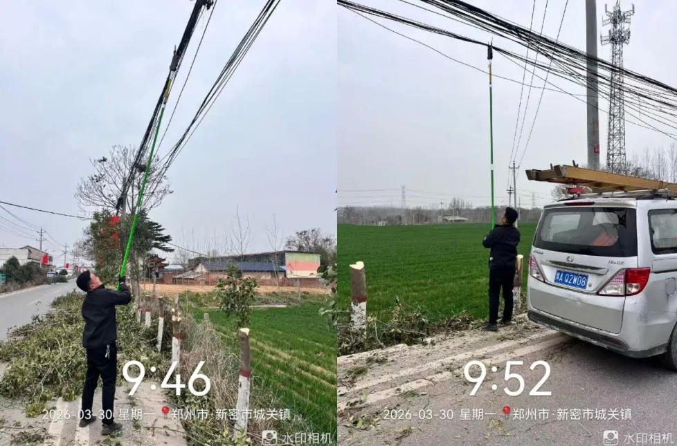 郑州联通讯(新密分公司:石全伟、杨书伟)2026年3月30日,为配合新密市园林局春季绿化树修剪工作,新密联通管线网格主动出击,组织6名技术骨干、出动2辆工程车,分赴城关镇、青屏街道两个作业点,同步开展下垂光缆捆扎整治,累计捆扎线缆1.3公里,以实际行动消除安全隐患、美化城市环境,为创建文明城市贡献联通力量。