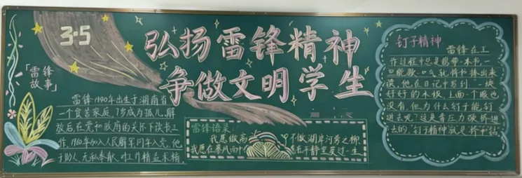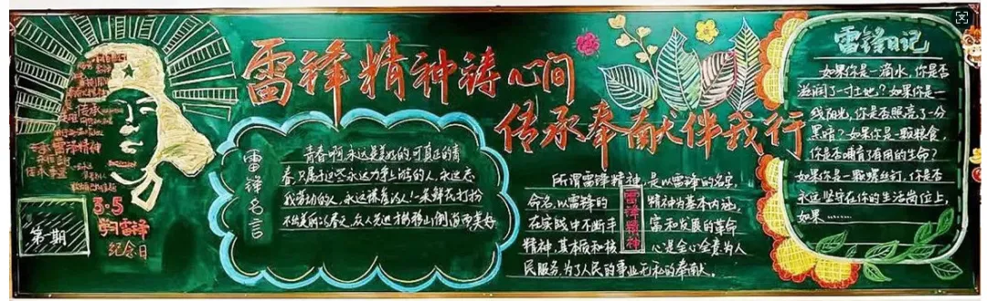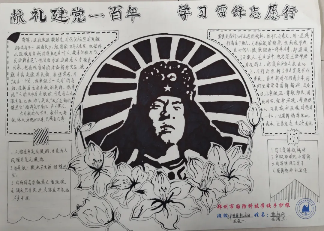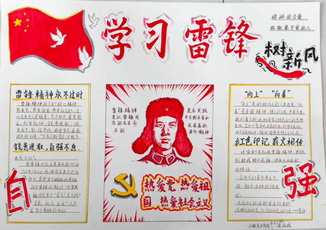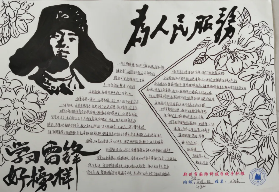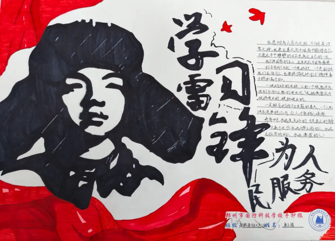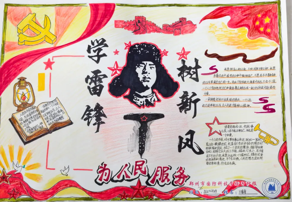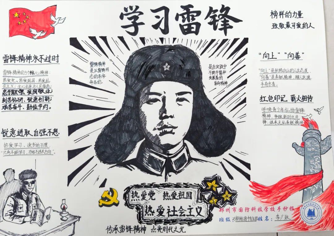 手抄报创作中,同学们以纸张为载体,运用水彩、彩铅等多种艺术形式,将雷锋精神生动诠释。作品中,既有雷锋同志的肖像剪影,也有他助人为乐、无私奉献的经典事迹;既有对雷锋精神的深刻感悟,也有新时代国防学子践行雷锋精神的坚定承诺。色彩搭配鲜明和谐,版面设计错落有致,书写工整规范,每一笔、每一划都饱含着同学们对雷锋同志的敬仰之情,每一幅作品都彰显着青春学子的创意与担当,展现了新时代中职生的良好精神风貌。