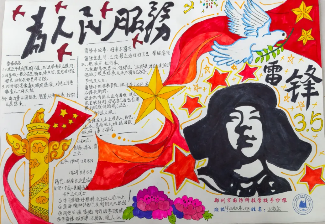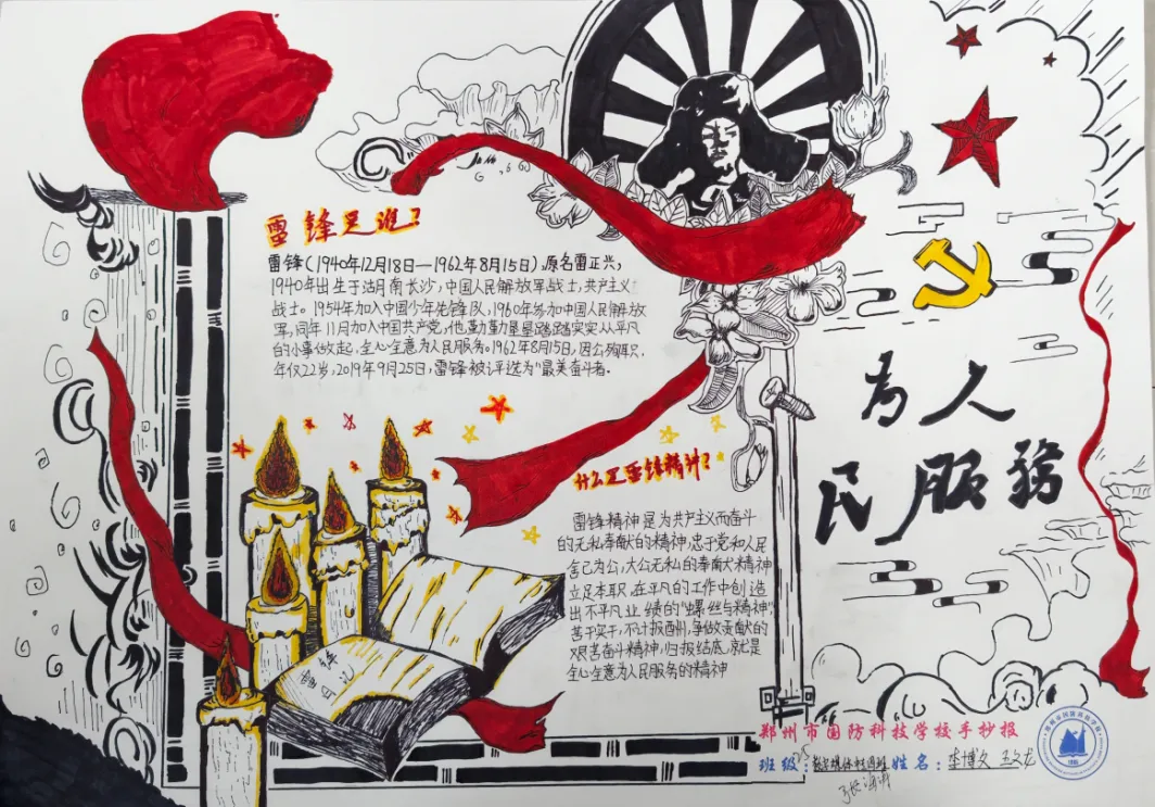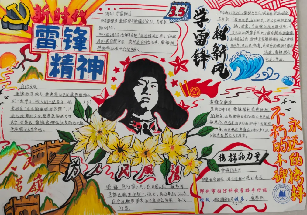 春风送暖传美德,锋火相传润心田。为深入推进学雷锋活动月各项工作,传承“奉献、友爱、互助、进步”的志愿精神,深化校园德育内涵,营造“人人学雷锋、时时学雷锋、处处学雷锋”的浓厚氛围,近日,郑州市国防科技学校学雷锋活动月手抄报、黑板报评比活动圆满落幕,评比结果正式揭晓。经过严格、公正的评审,一批主题鲜明、创意新颖、制作精美的作品脱颖而出,充分展现了国防学子对雷锋精神的深刻理解与青春担当。