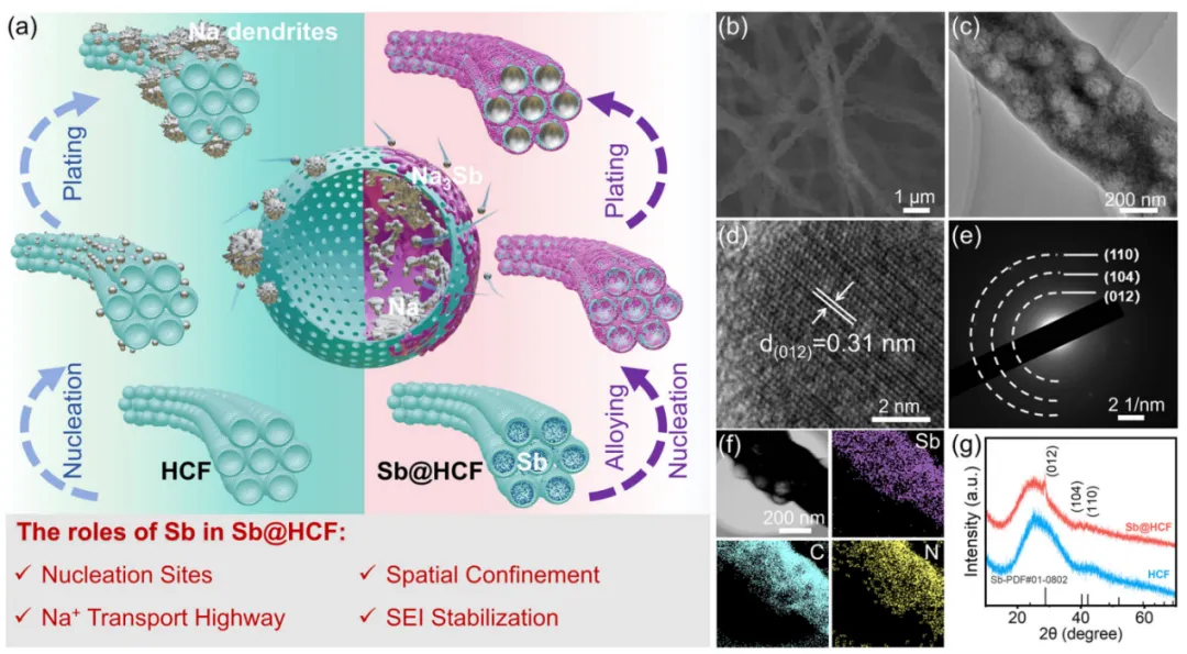 图1.结构与组成表征。(a)Sb@HCF与HCF的钠沉积行为示意图对比。(b)SEM图像,显示Sb@HCF的三维纤维状结构。(c)TEM图像显示空心腔体及Sb纳米颗粒的均匀分布。(d)Sb晶粒的高分辨透射电子显微镜图像。(e)Sb@HCF的SAED。(f)Sb@HCF中Sb、C和N的EDS元素mapping。(g)Sb@HCF和HCF的XRD图。