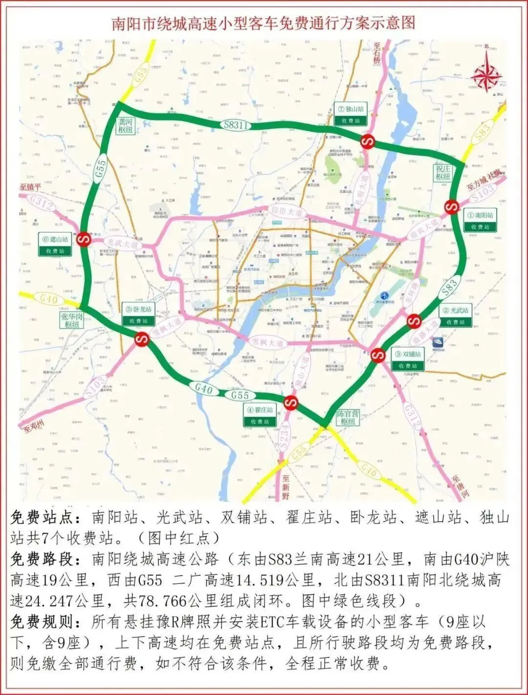 南阳站、光武站、双铺站、翟庄站、卧龙站、遮山站、独山站共7个收费站。