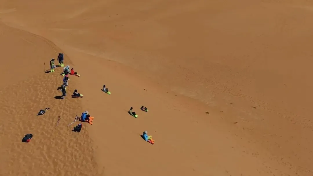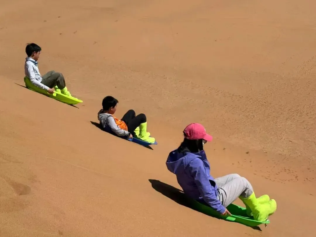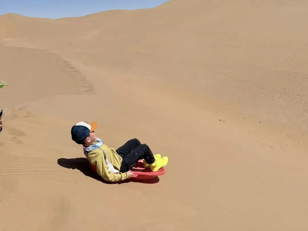 碰到高高的沙丘,就拿上滑沙板,上去滑沙