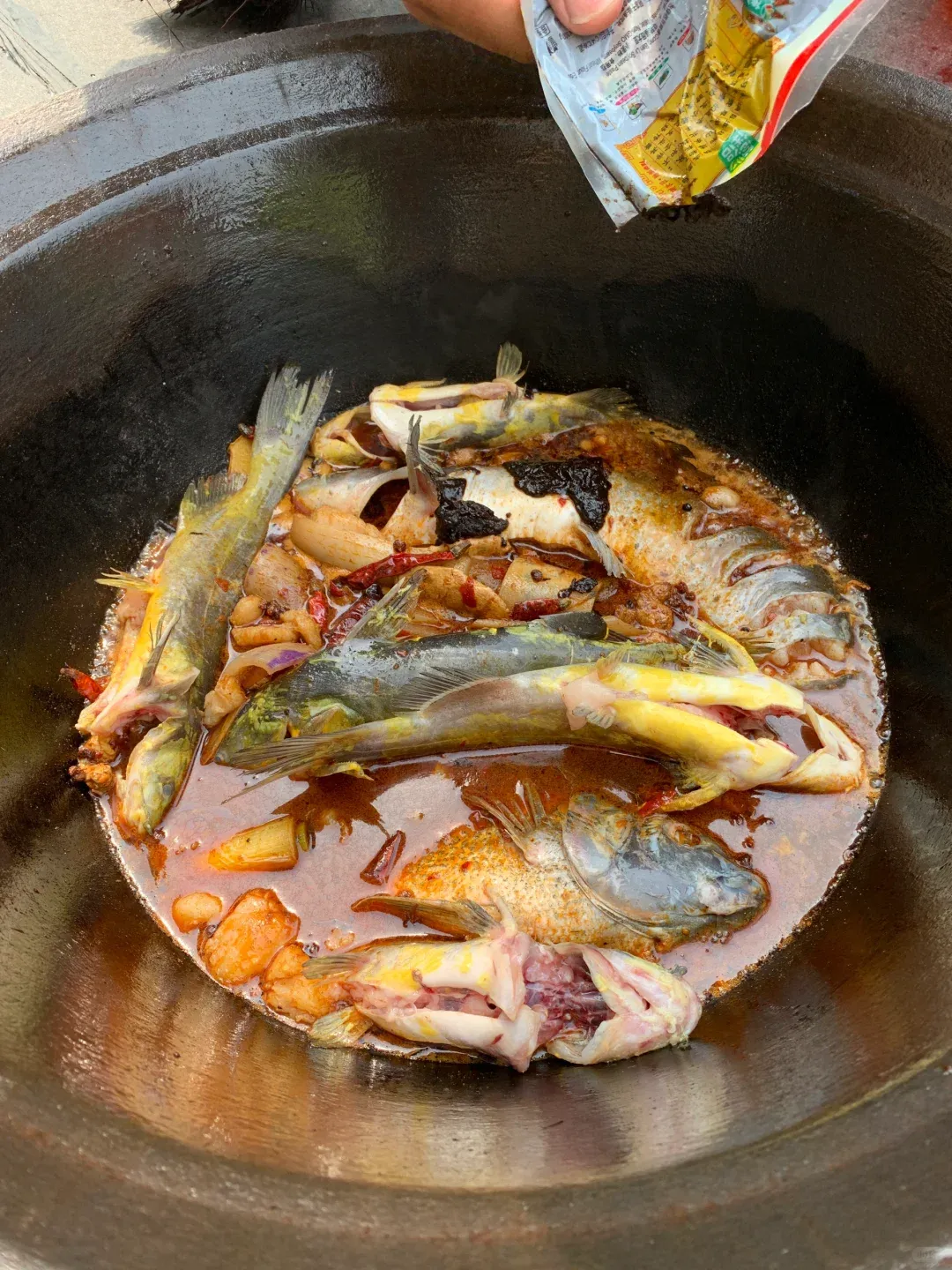 这是一家连招牌都掉色的水上船屋。铁锅端上来时,锅沿的高温烫得空气都在微微扭曲。刚从运河里捞上来的杂鱼,和切得厚实的五花肉一起在浓汁里咕嘟作响。铁锅边缘贴着一圈死面饼子,底部浸满鱼汤,上半截被火烤得焦脆。一家三口顾不上烫,伸手撕扯着面饼蘸汤吃。满嘴的酱香和焦香,吃出了一头细汗。在这种地方,吃相是最不需要的东西。